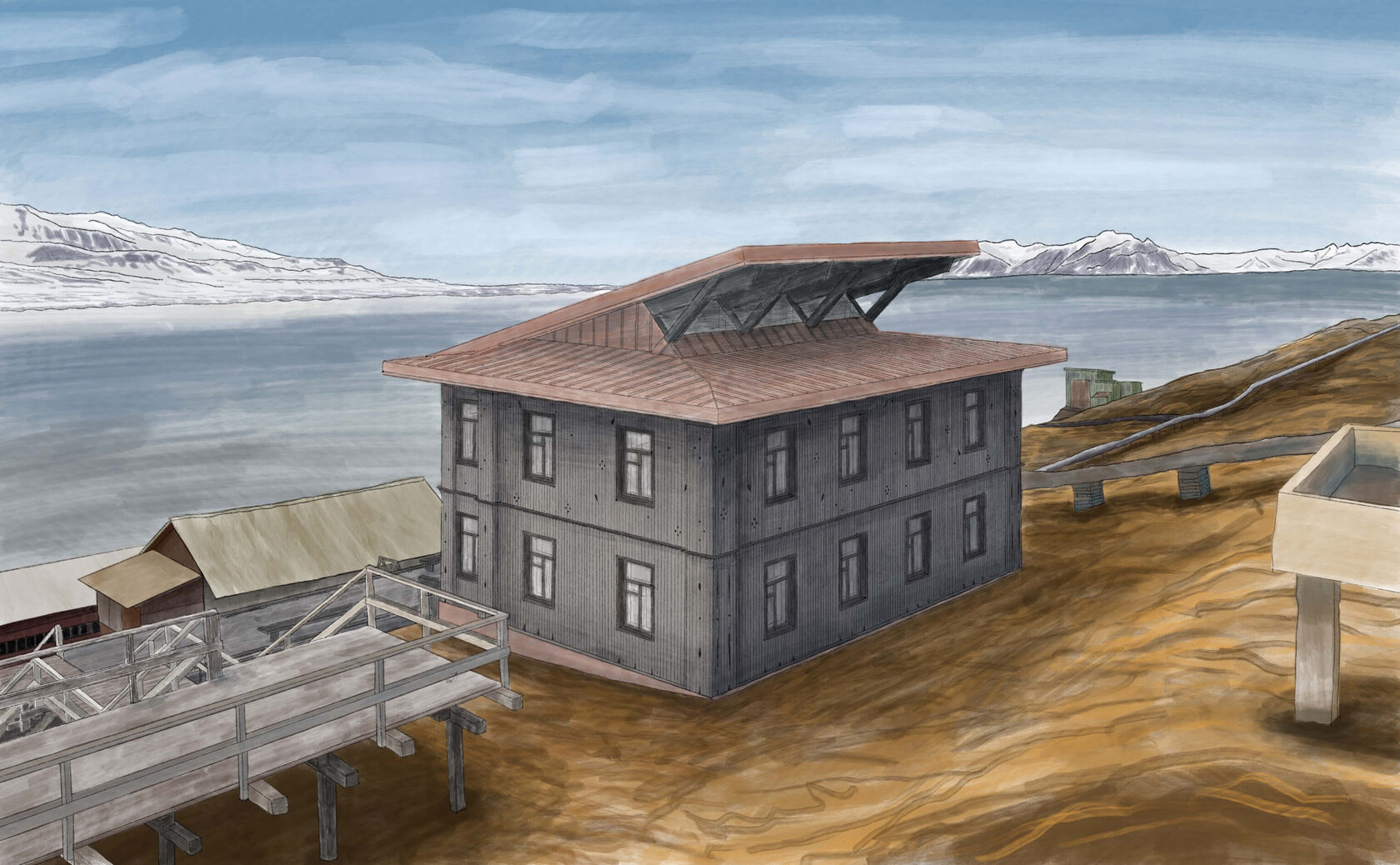 Это первое здание, которое гости Баренцбурга видят с воды, поэтому проект также подразумевает восстановление утраченной башни, чтобы добавить побережью навигационную вертикаль. Для реконструкции здания студенты опирались на канадскую технологию строительства домов в условиях вечной мерзлоты.