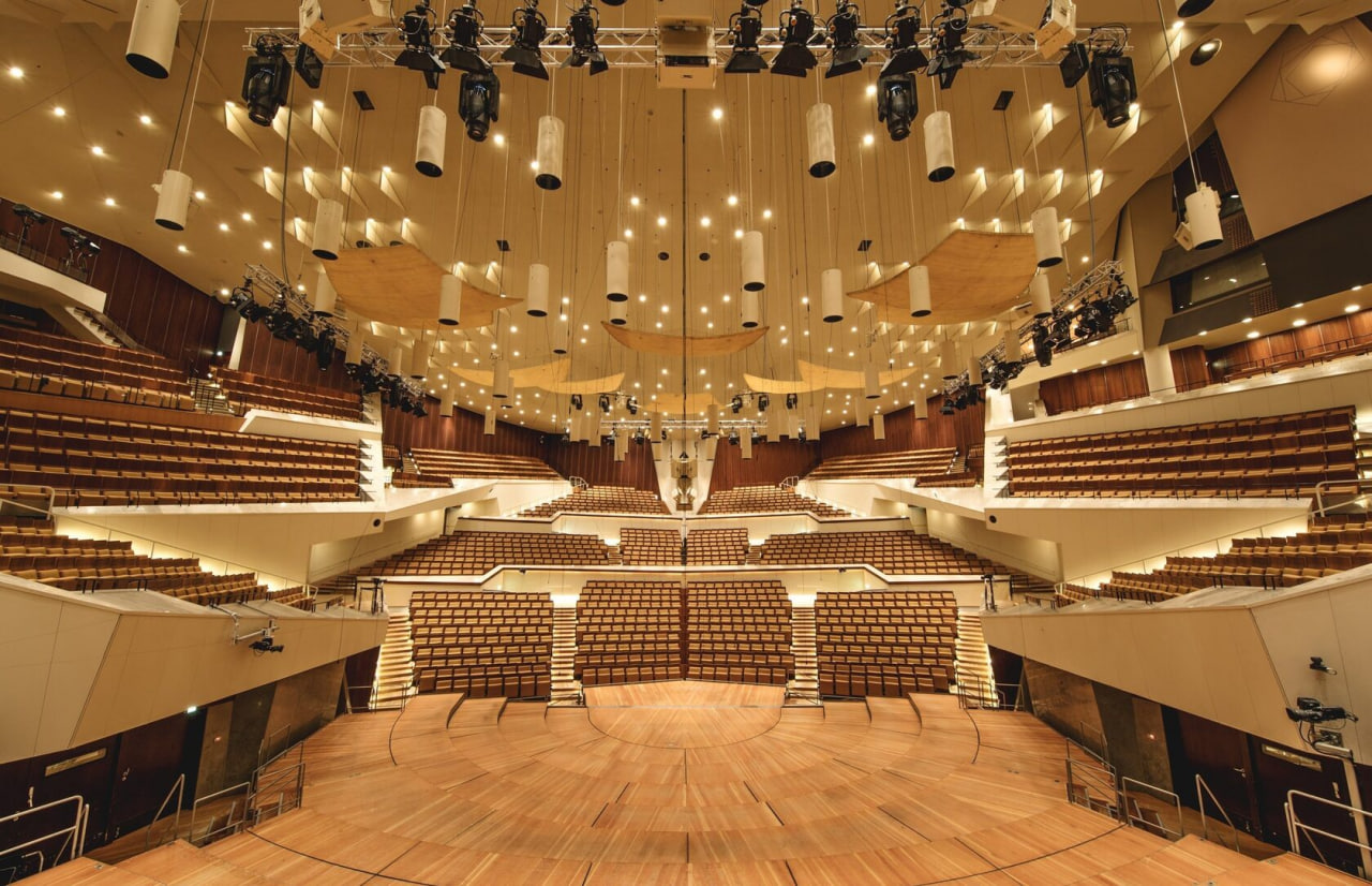 Наиболее показательным современным примером подобной взаимосвязи являются концертные залы — пространства, где архитектура и звук буквально становятся единым целым, а аудиальное восприятие пространства формирует общий опыт от присутствия в нем. В середине XX века идея получила яркое воплощение в проекте Берлинской филармонии архитектора Ханса Шаруна. В ней автор предложил радикально новую схему рассадки в стиле виноградника, назвав расположение блоков посетителей «восходящими виноградниками». Эта планировка подразумевает, что террасы, поднимаются не перед, а вокруг центральной сцены для оркестра. Акустическая отделка зала состоит из панелей дерева камбала с перфорацией и звукопоглощающей подложкой: они одновременно отражают и приглушают звук, создавая ощущение погружения.
