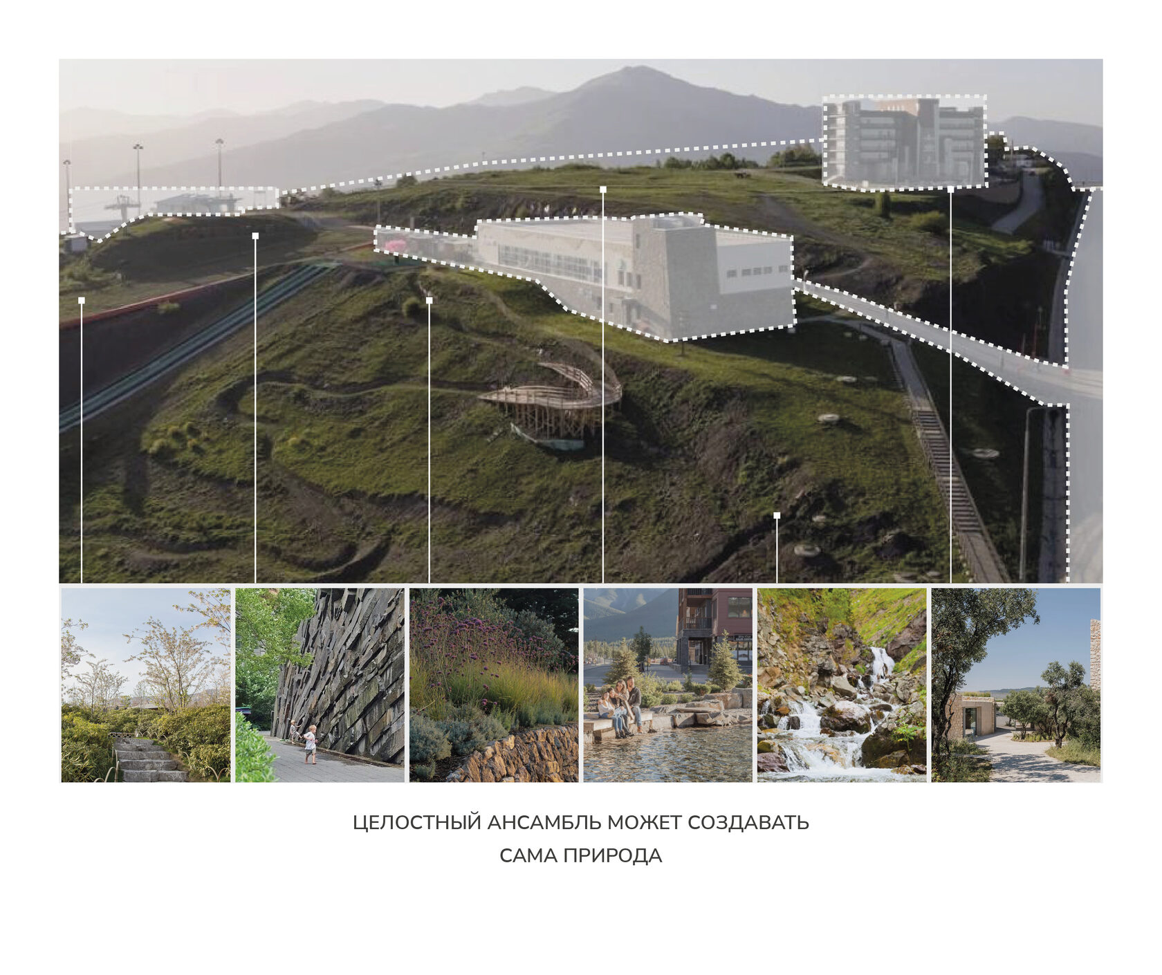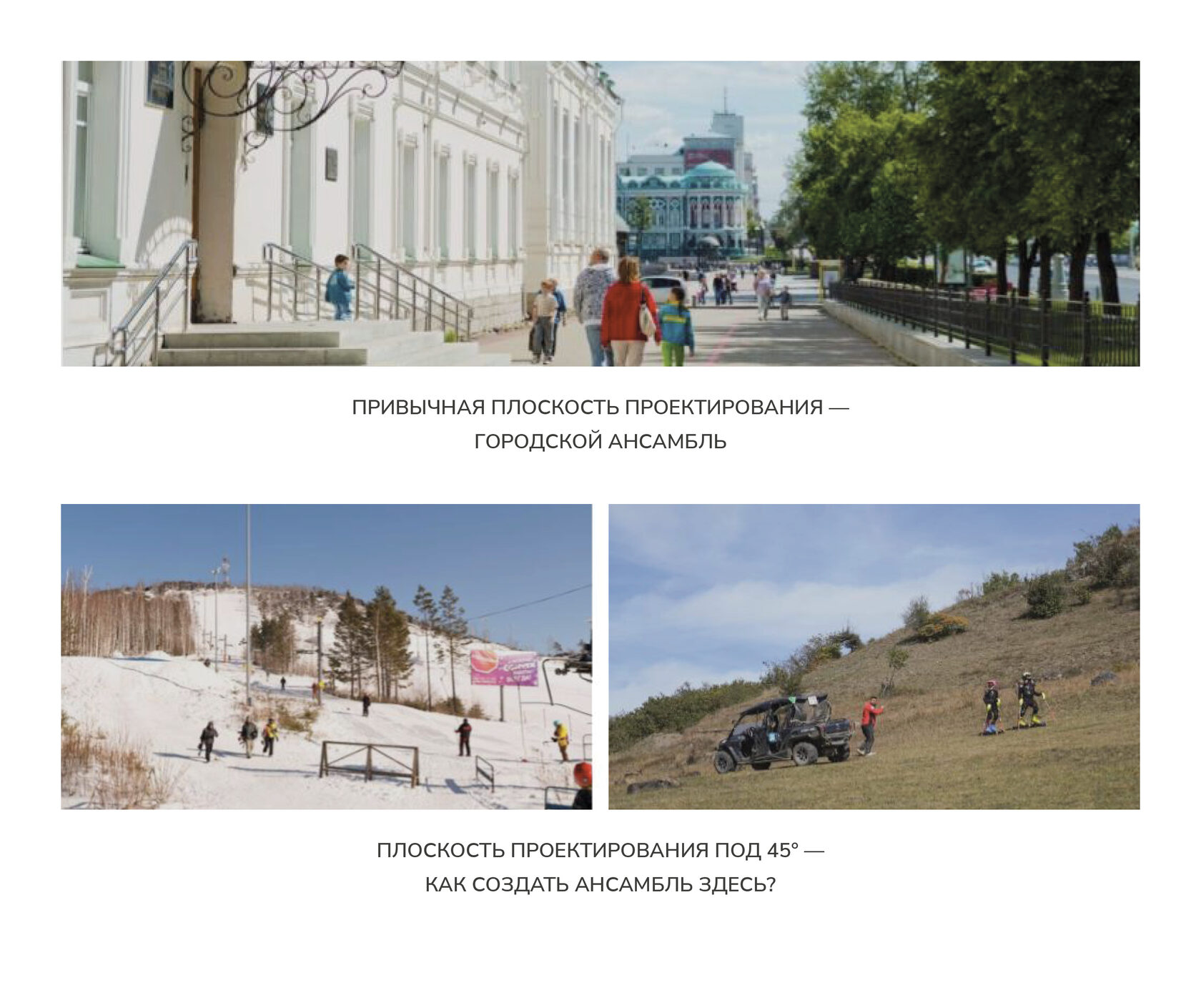Однако все меняется, когда плоскость проектирования буквально поворачивается на 45⁰ – например, на территории горнолыжного курорта, которому нужны концепция развития и стильный визуальный облик. Составить привычные для городской среды средовые ансамбли здесь невозможно – необходимых строений значительно меньше, а их пешая доступность осложняется рельефом. Стейкхолдеры такого проекта также отличаются от привычных для городских объектов.