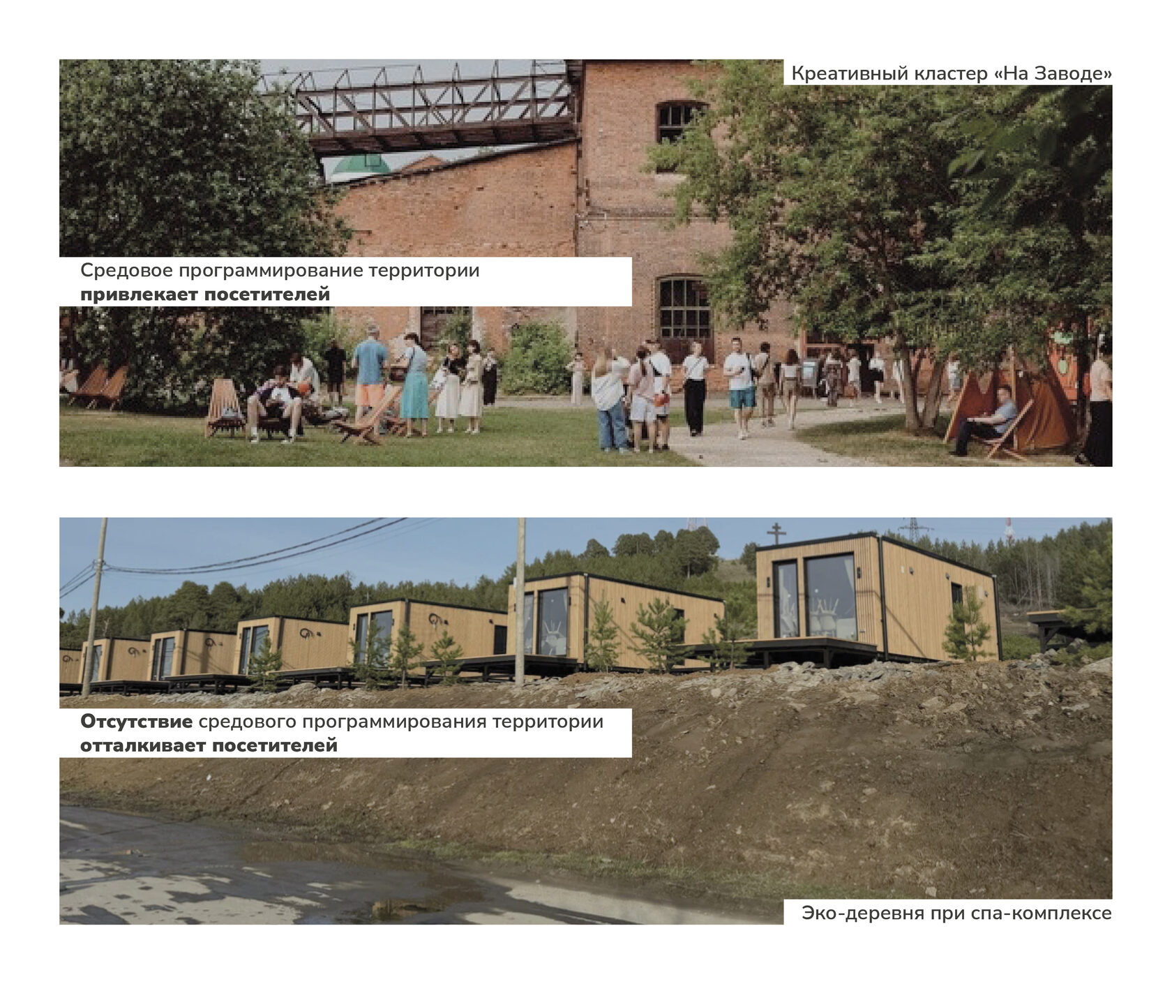 Задача планировщиков — выявить и обосновать средообразующий ландшафт как основу проекта: и технологическую, и маркетинговую. Важно показать, что наглядные природные процессы — это уникальный аттрактор, который следует отразить в зонировании, инфраструктуре и архитектуре.