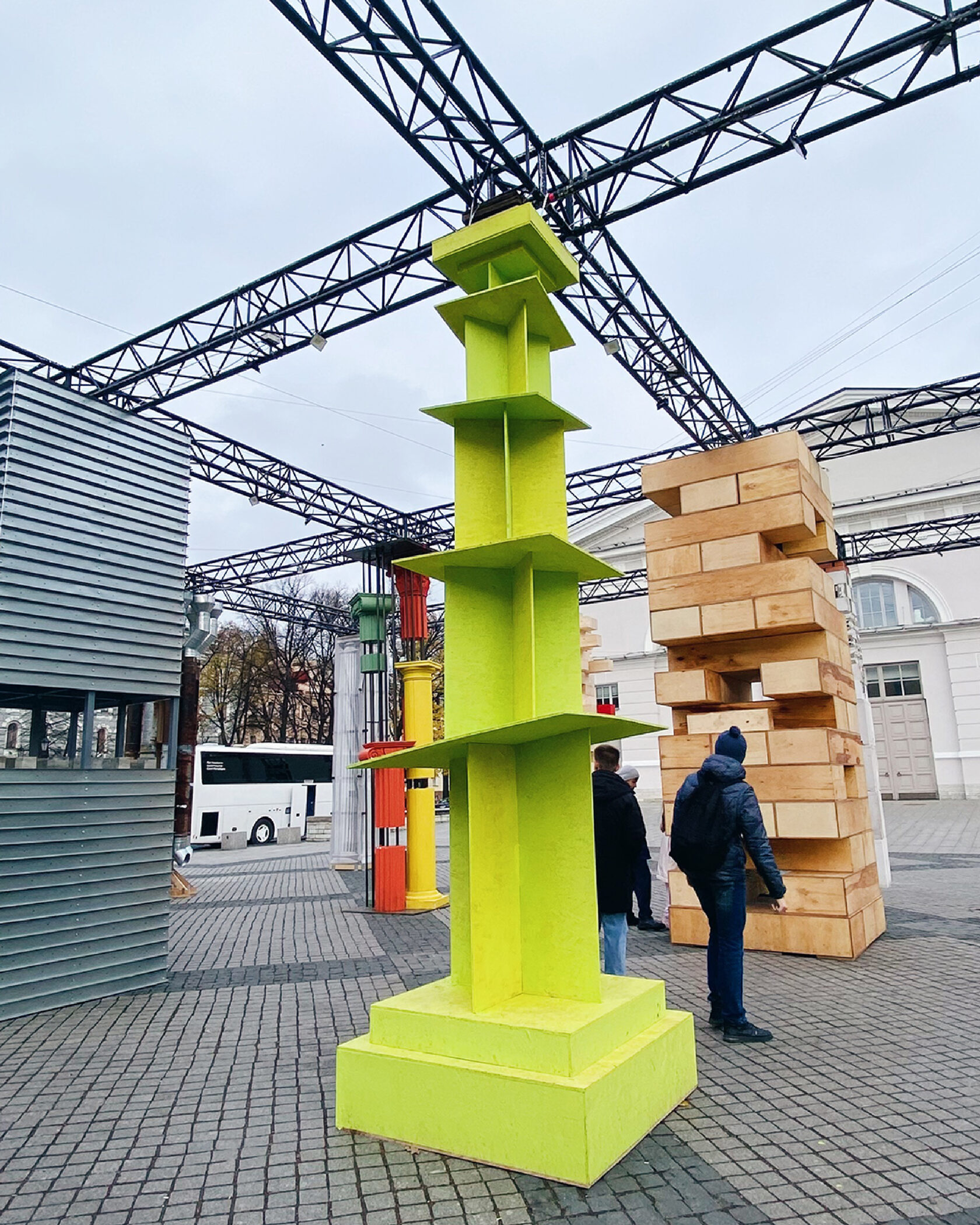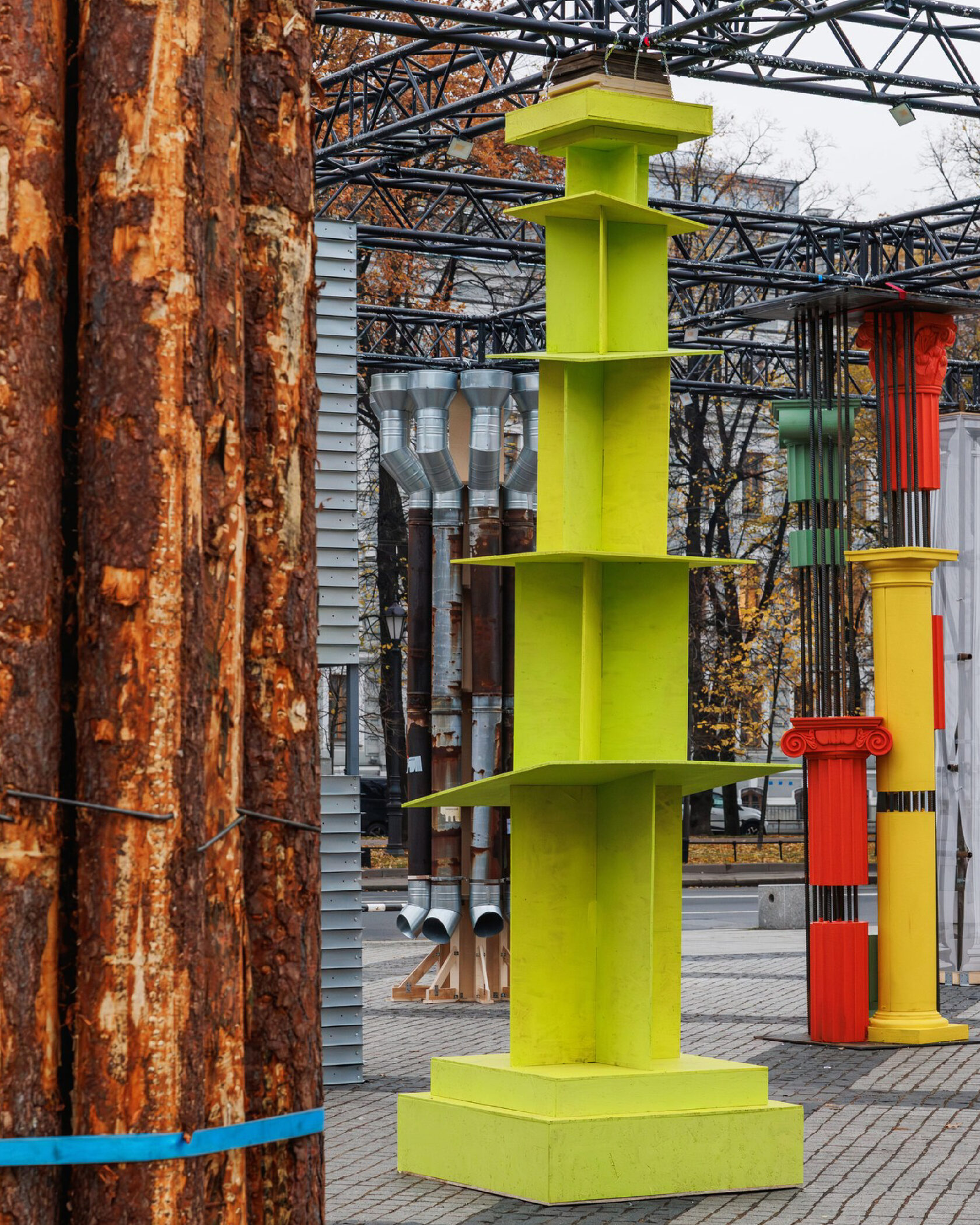 Арт-объект «Спираль архитектурного кода» — монументальная колонна из OSB, синтезирующая историко-культурные коды. Это прямая метафора движения времени по спирали, воплощенная в архитектурной форме. Восходящая спираль показывает, как циклы истории повторяются, но не тождественны прошлому — каждый виток «закручивается» вокруг опыта предыдущих эпох. Объект отсылает к античности, готике, барокко и авангарду.