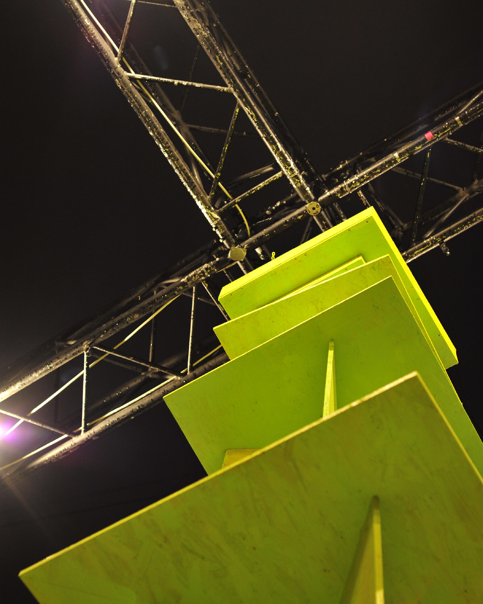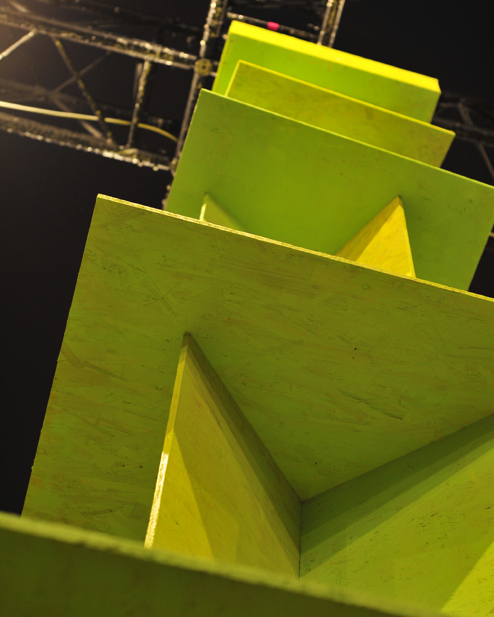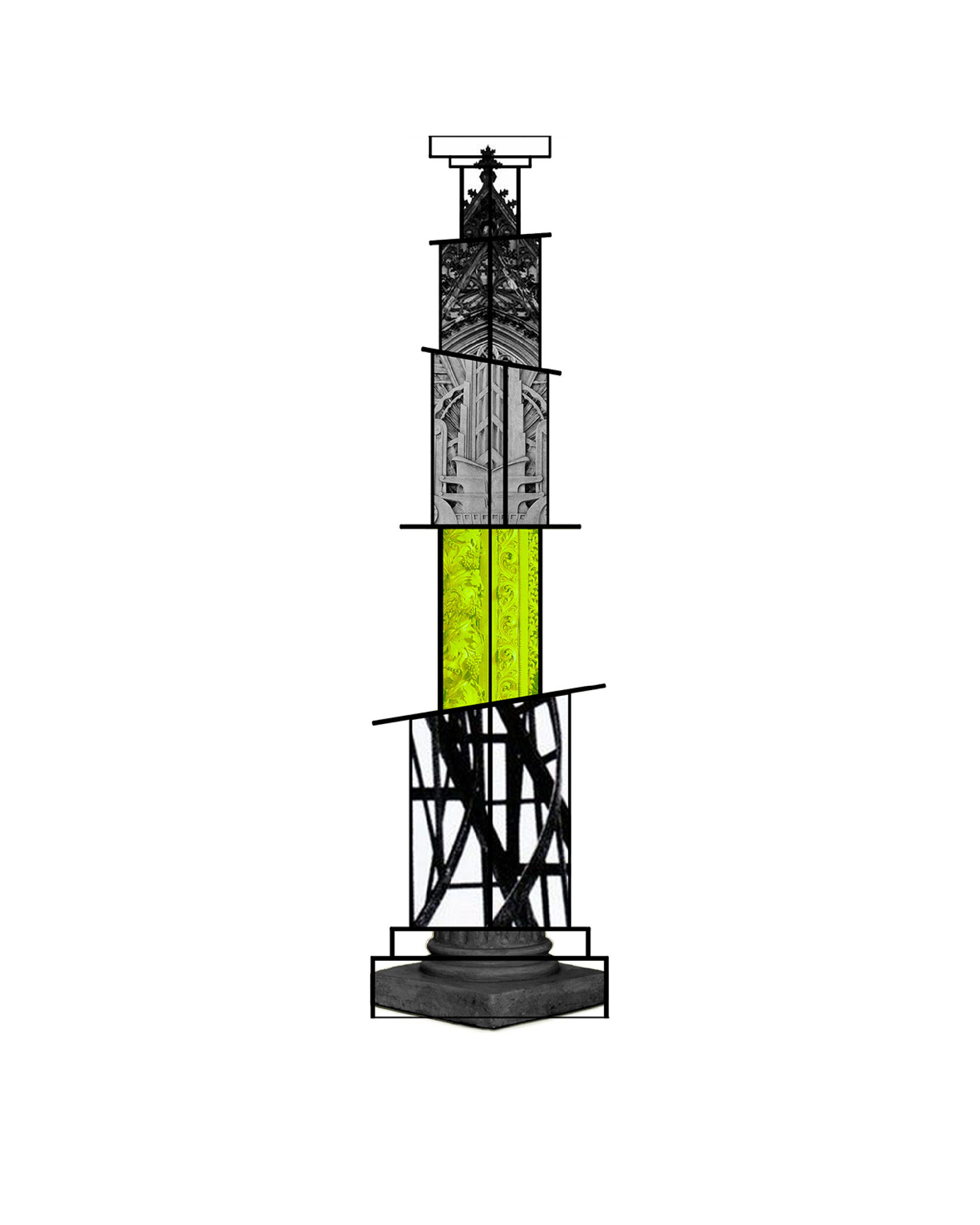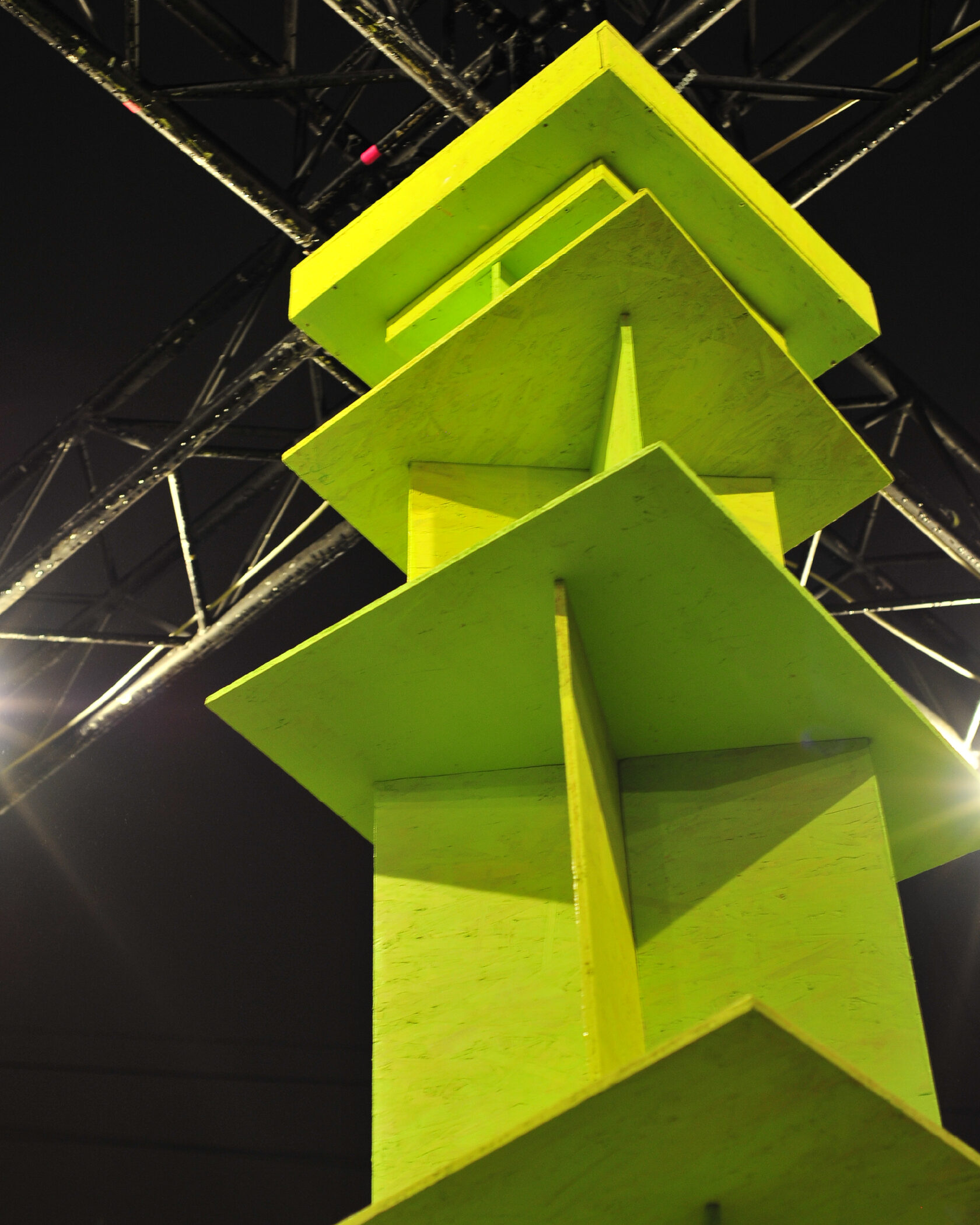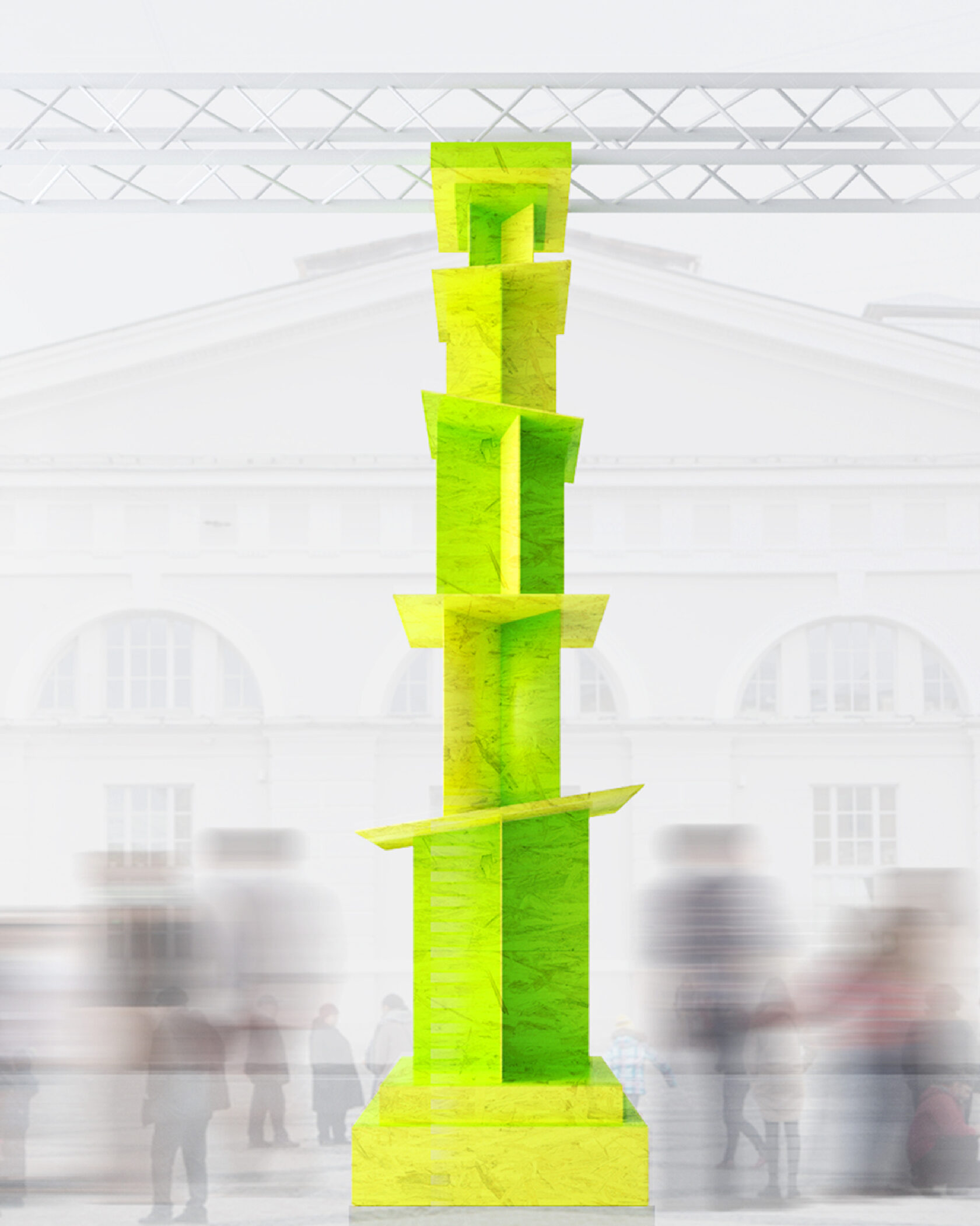 Оптическая иллюзия искажает восприятие объема: массивное основание, кажется, легче, а вершина — шире, символизируя субъективность восприятия времени. Иллюзию усиливает цвет: два близких лаймовых оттенка создают вибрацию, «меняясь местами» в зависимости от освещения и ракурса. Это создает ощущение пульсации времени, состоящего из множества оттенков «сейчас». Использованием лаймового цвета авторы делают акцент на силе и энергии настоящего момента. Арт-объект буквально выстраивает структуру времени, где прошлое, настоящее и будущее связаны в едином, непрерывно развивающемся движении.