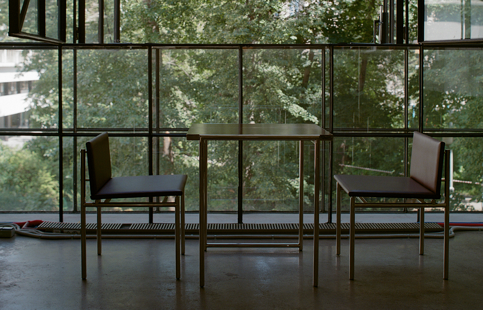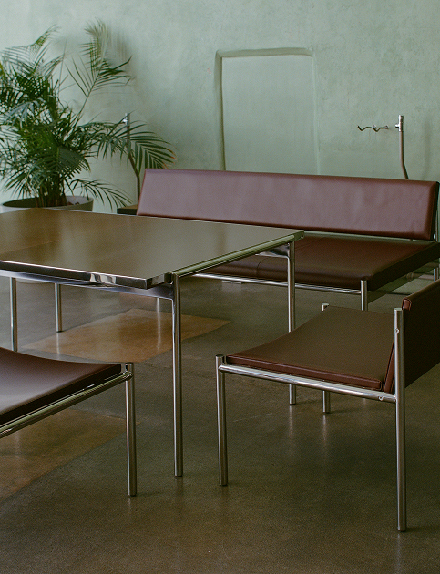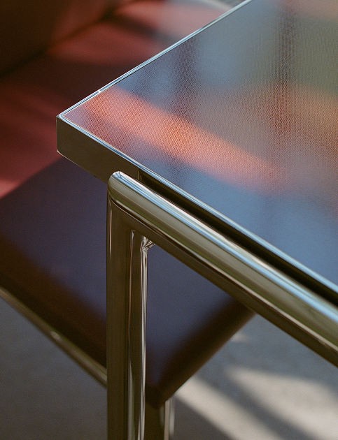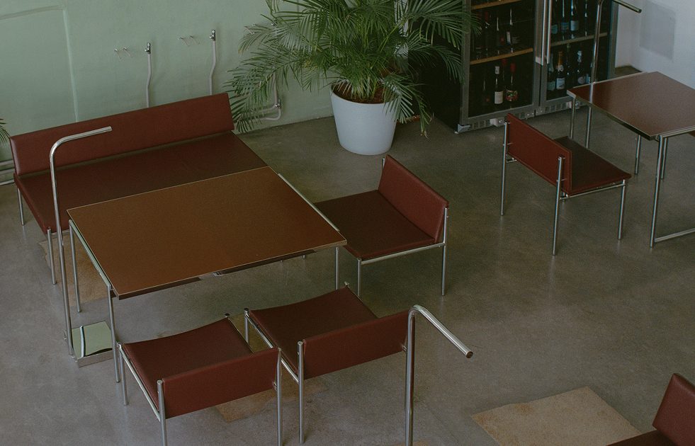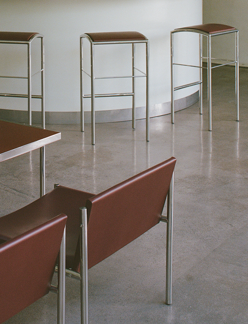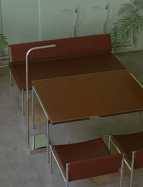Красно-коричневая кожа стульев вызывает ассоциации с общественными интерьерами советского периода. Столешницы из текстолита демонстрируют художественный потенциал утилитарного материала. Каждая деталь — результат инженерной точности, вдумчивой проработки и тактильной выразительности.