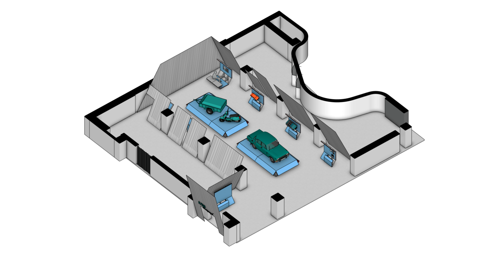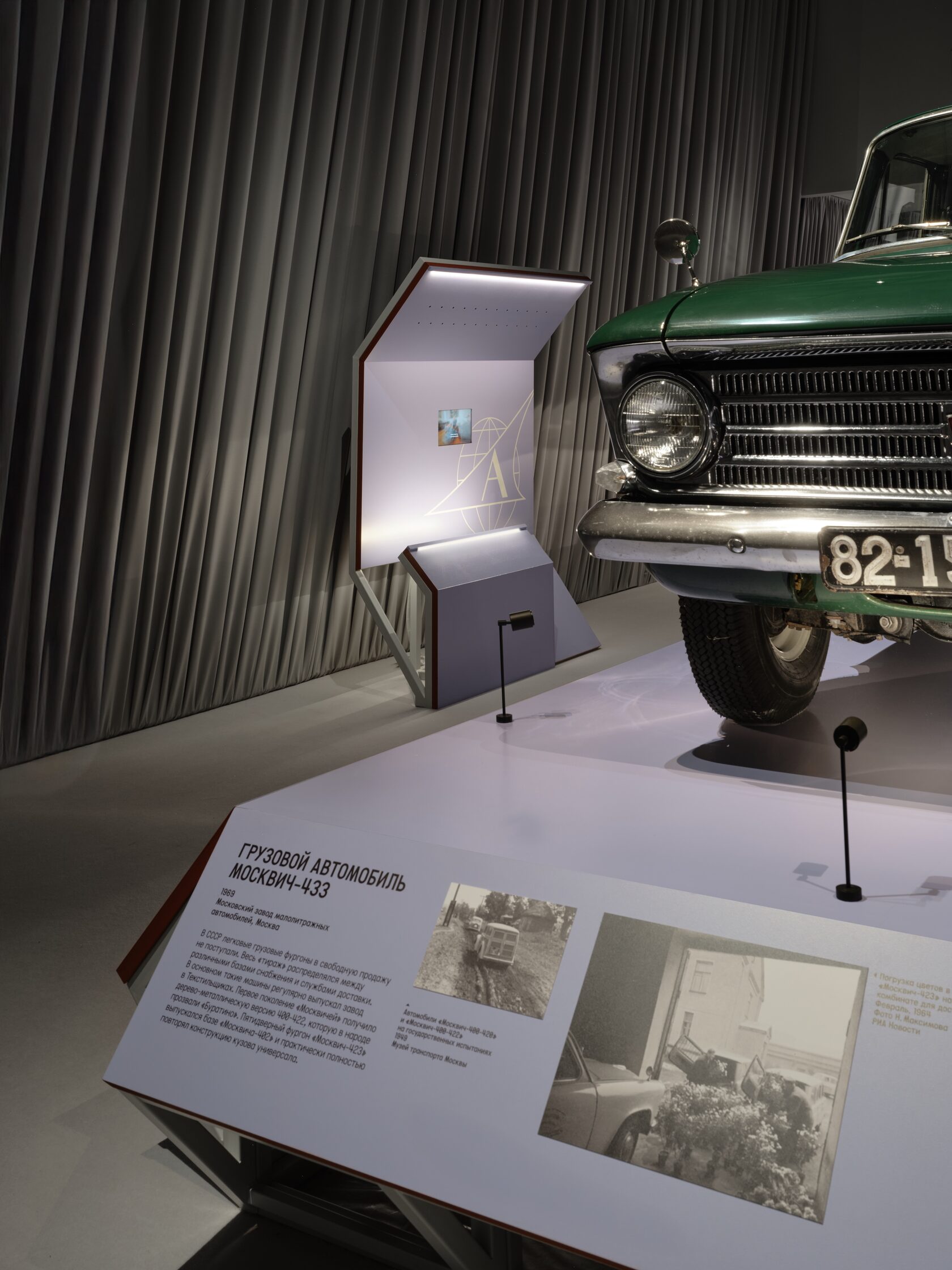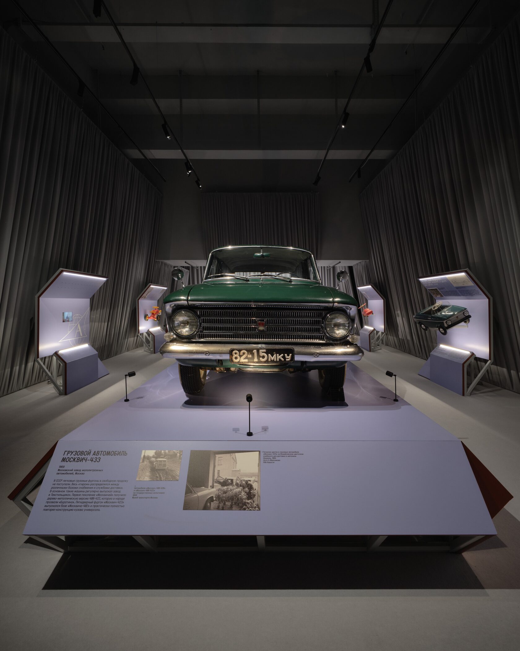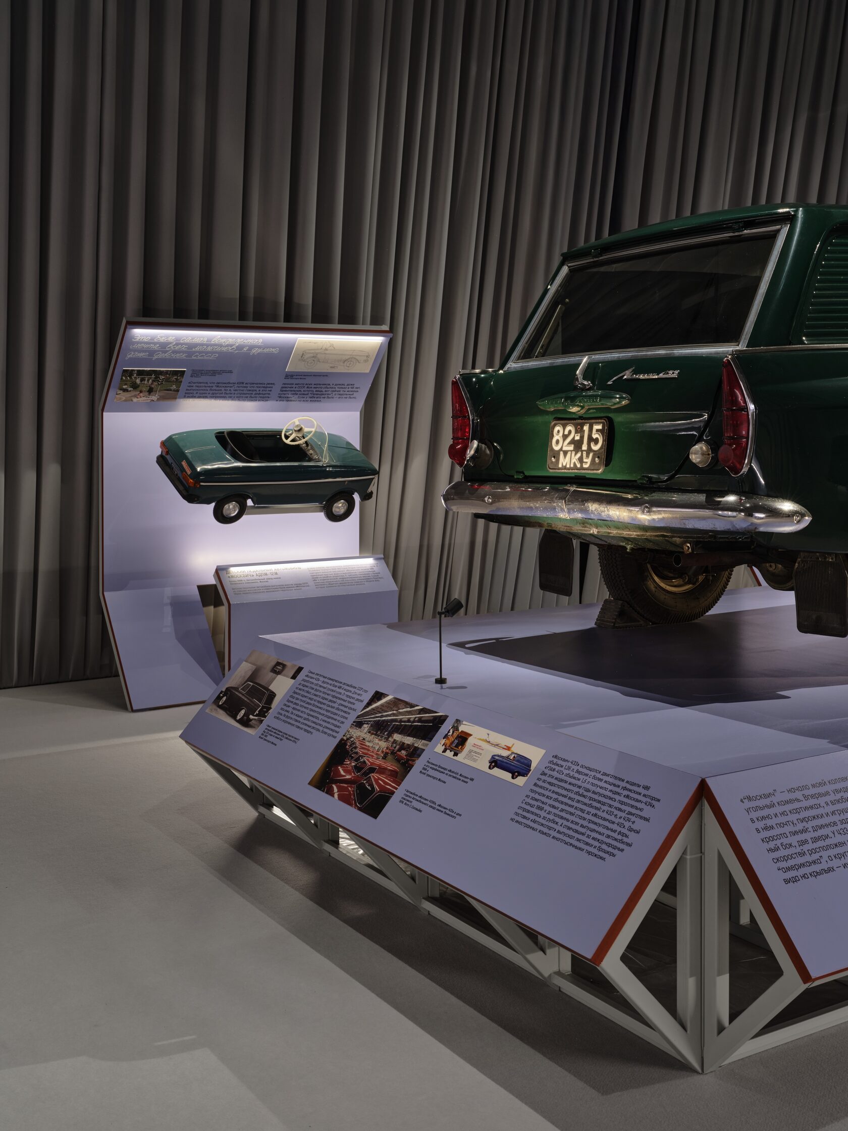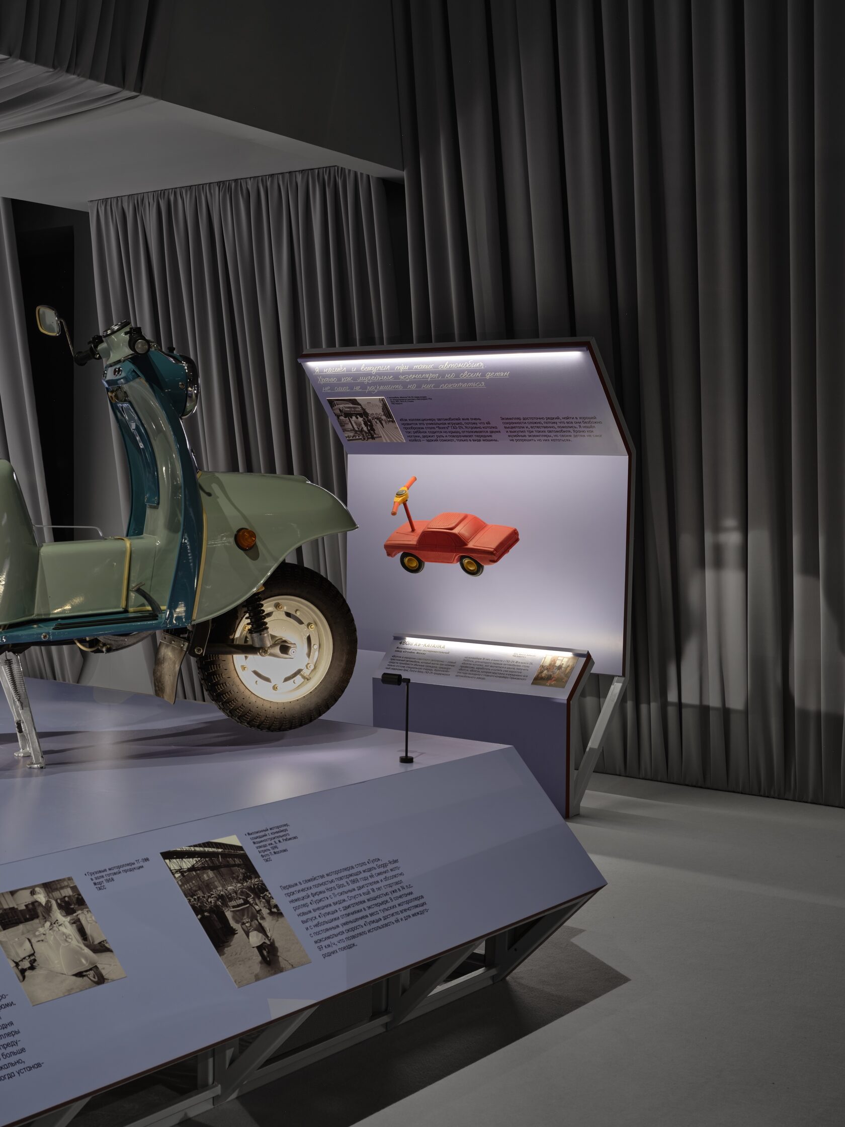 Центральными элементами стали три подиума из металлического каркаса и МДФ. На одном из них разместился грузовой автомобиль «Москвич-433» 1969 года, на двух объединённых — «Скиф-М1» 1989 года и мотороллер «Тулица». Такое расположение обеспечило пространственную симметрию и акцентировало внимание на главных экспонатах.