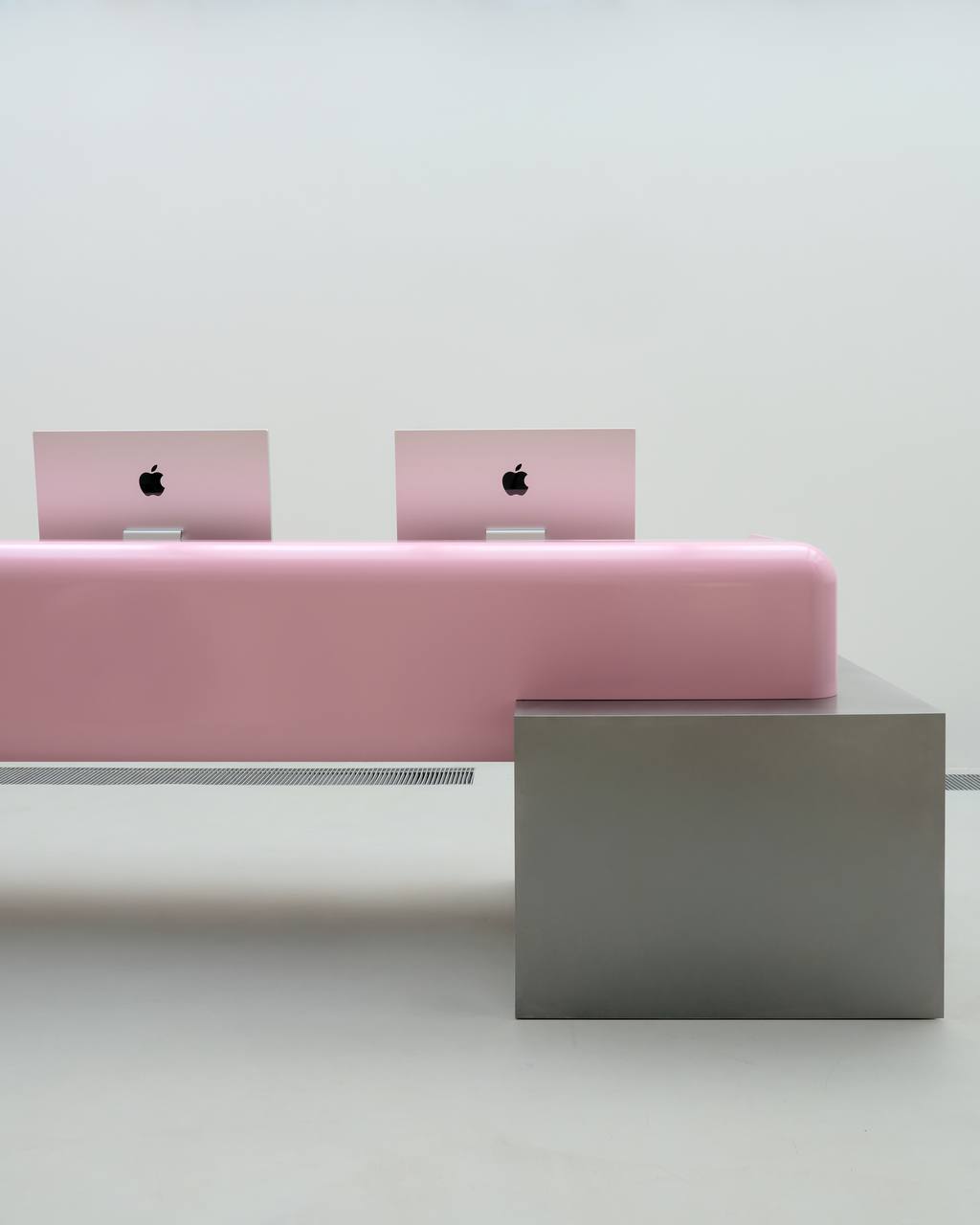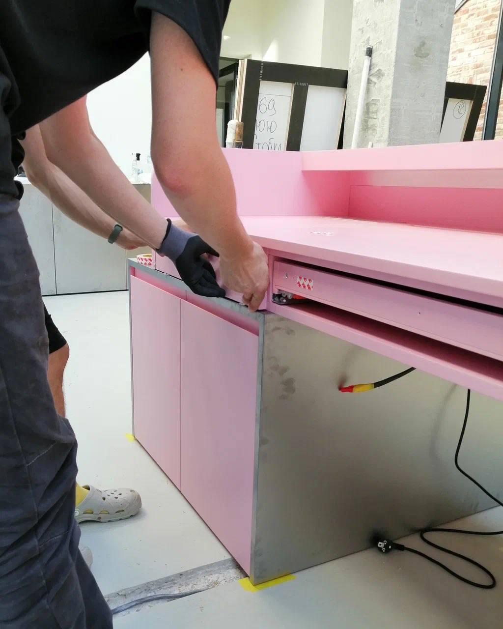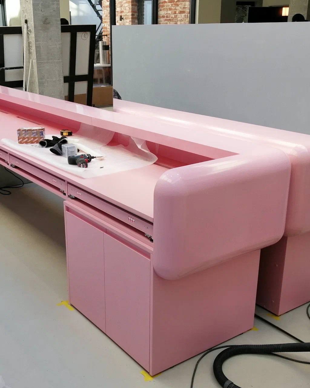 Этот проект был создан специально для кассовой зоны фотоателье UU в Москве, где важны не только функциональность и долговечность, но и выразительный визуальный акцент. В основе концепции — яркий розовый цвет, ставший фирменным жестом пространства: насыщенный, глянцевый, динамичный, он задаёт настроение и делает стойку центральным элементом интерьера.