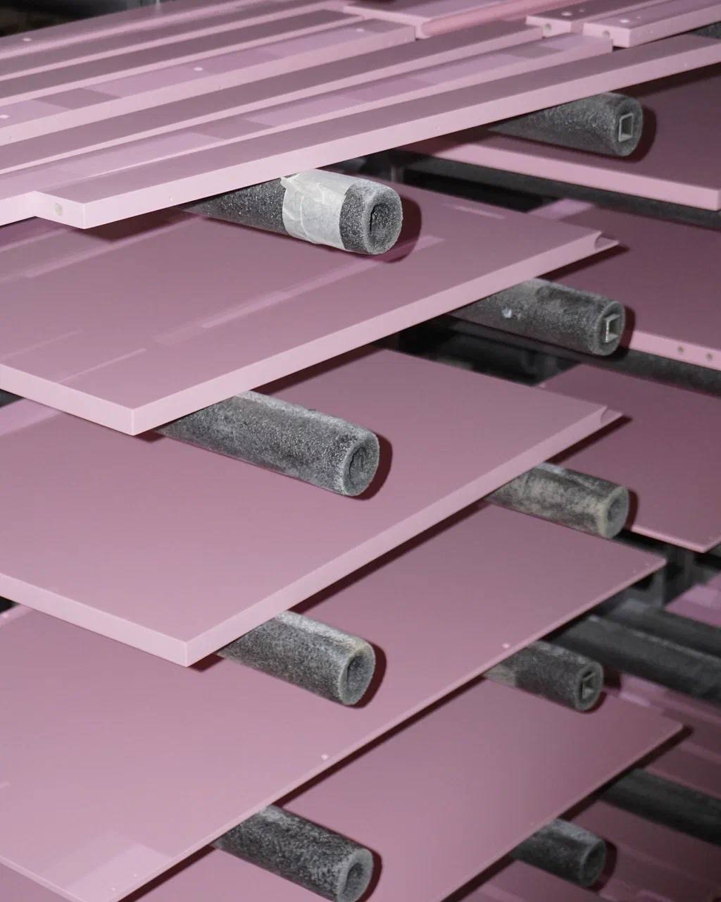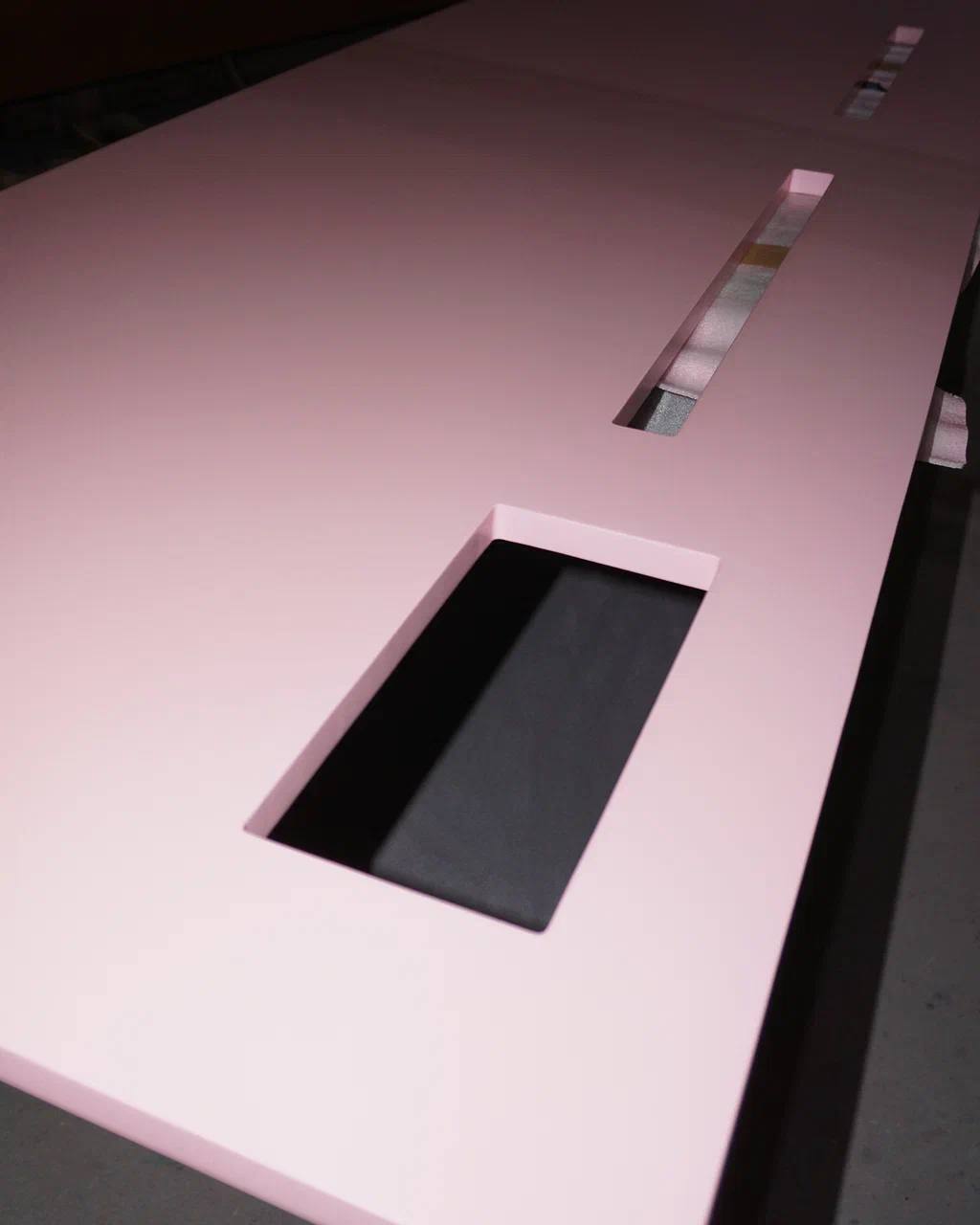 Чтобы добиться идеально плавных радиусов на углах столешницы, мы использовали многослойную конструкцию из МДФ: подготовили слои, выполнили высокоточную ЧПУ-фрезеровку и вручную тщательно прошлифовали все элементы перед нанесением финишного покрытия. Завершающий слой — высокоглянцевая эмаль сочного розового оттенка, подчёркивающая задумку дизайнера. Вся фурнитура — исключительно премиальные комплектующие от австрийской компании Blum.