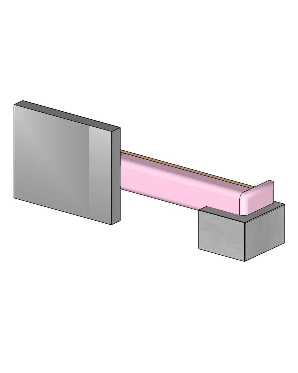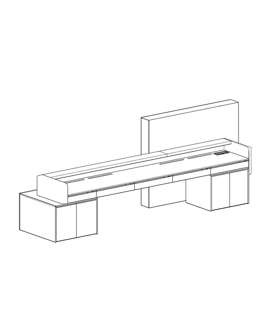 Длина стойки превышает четыре метра. Столешница опирается всего на две опоры, формируя впечатляющий двухметровый пролёт. Чтобы избежать провисания без добавления третьей опоры, мы оптимизировали конструкцию: облегчили внутреннюю часть и предусмотрели усиленное фанерное ребро жёсткости, сохранив лёгкость внешнего вида и обеспечив необходимую прочность.
