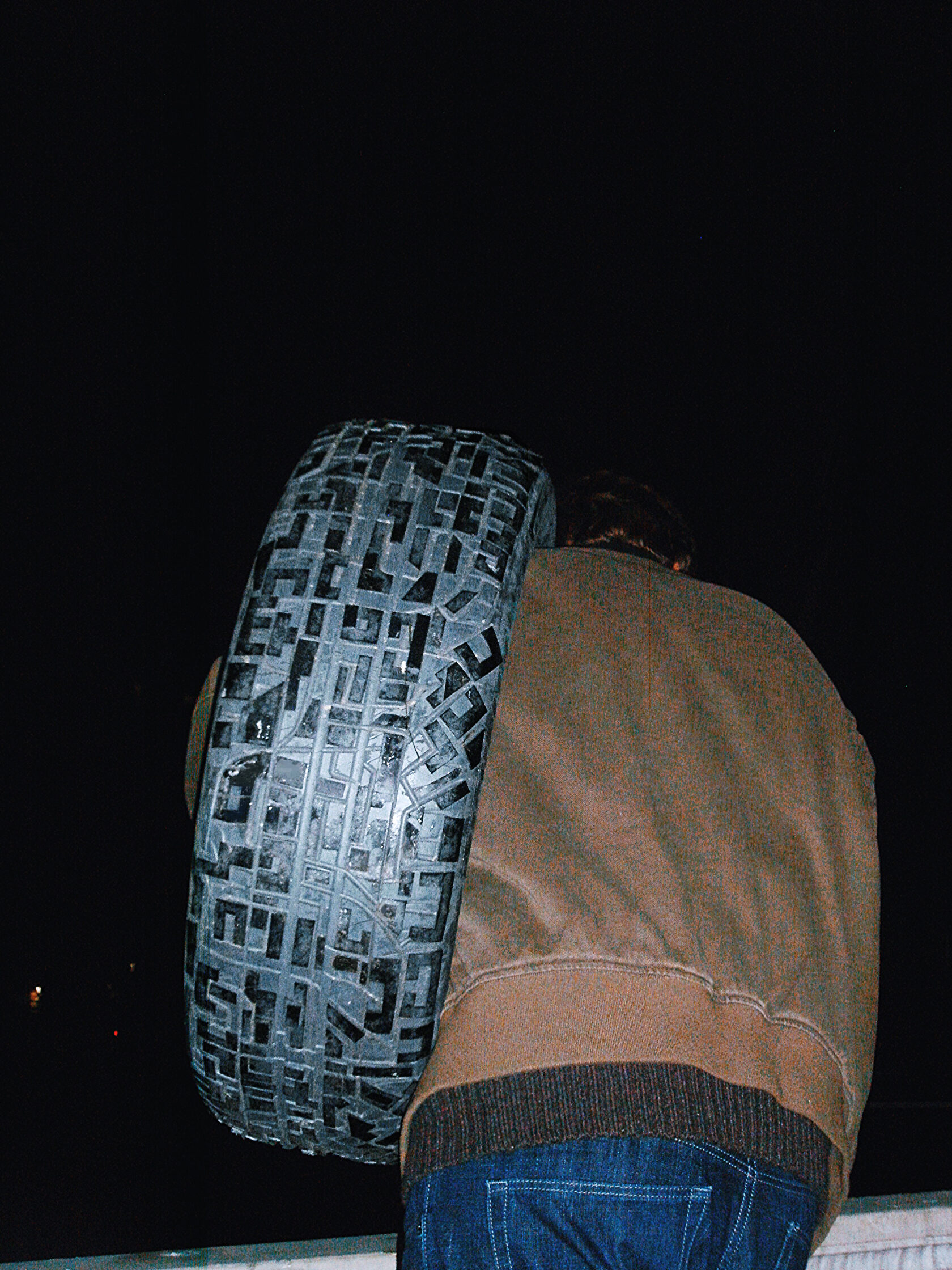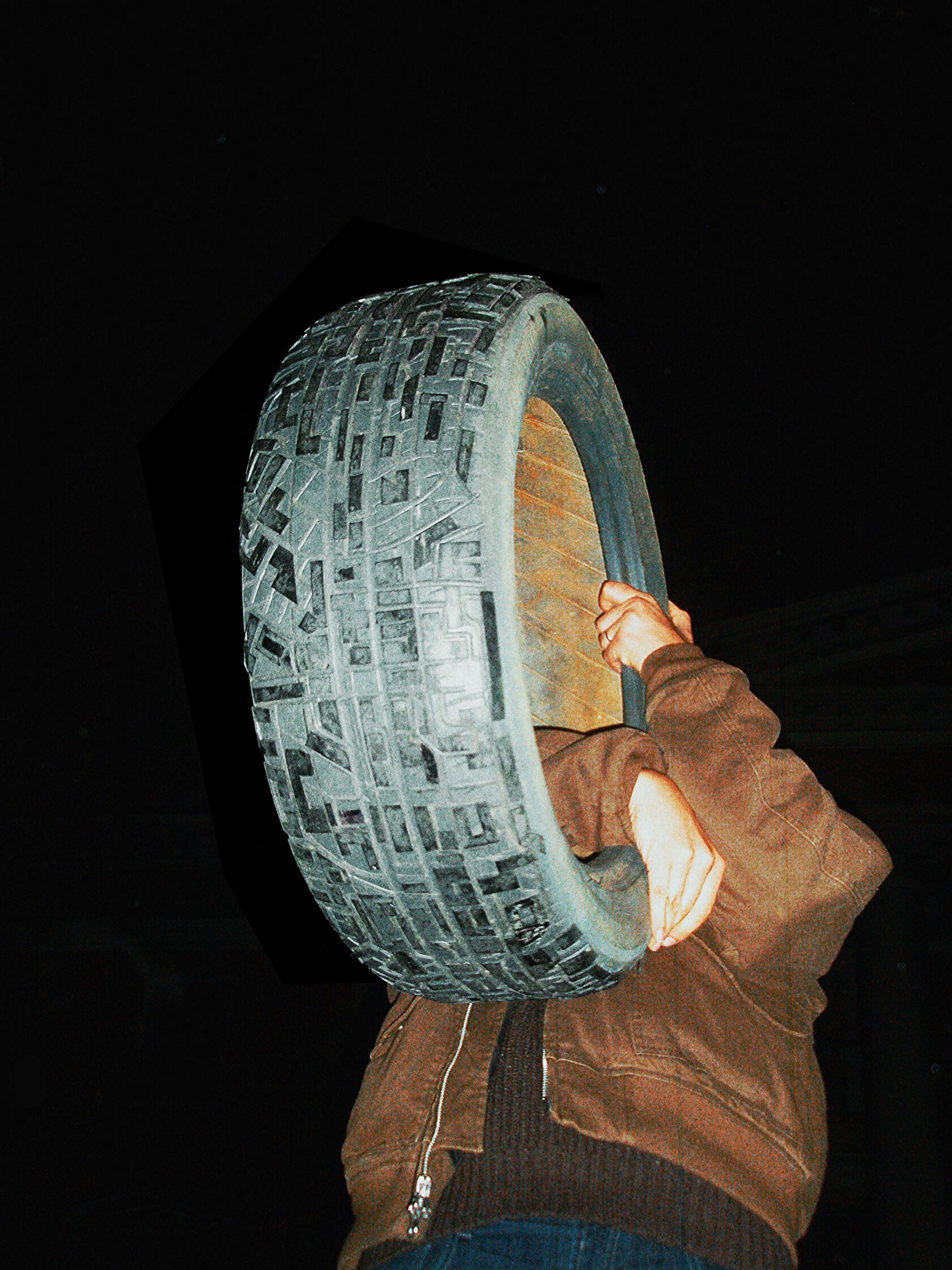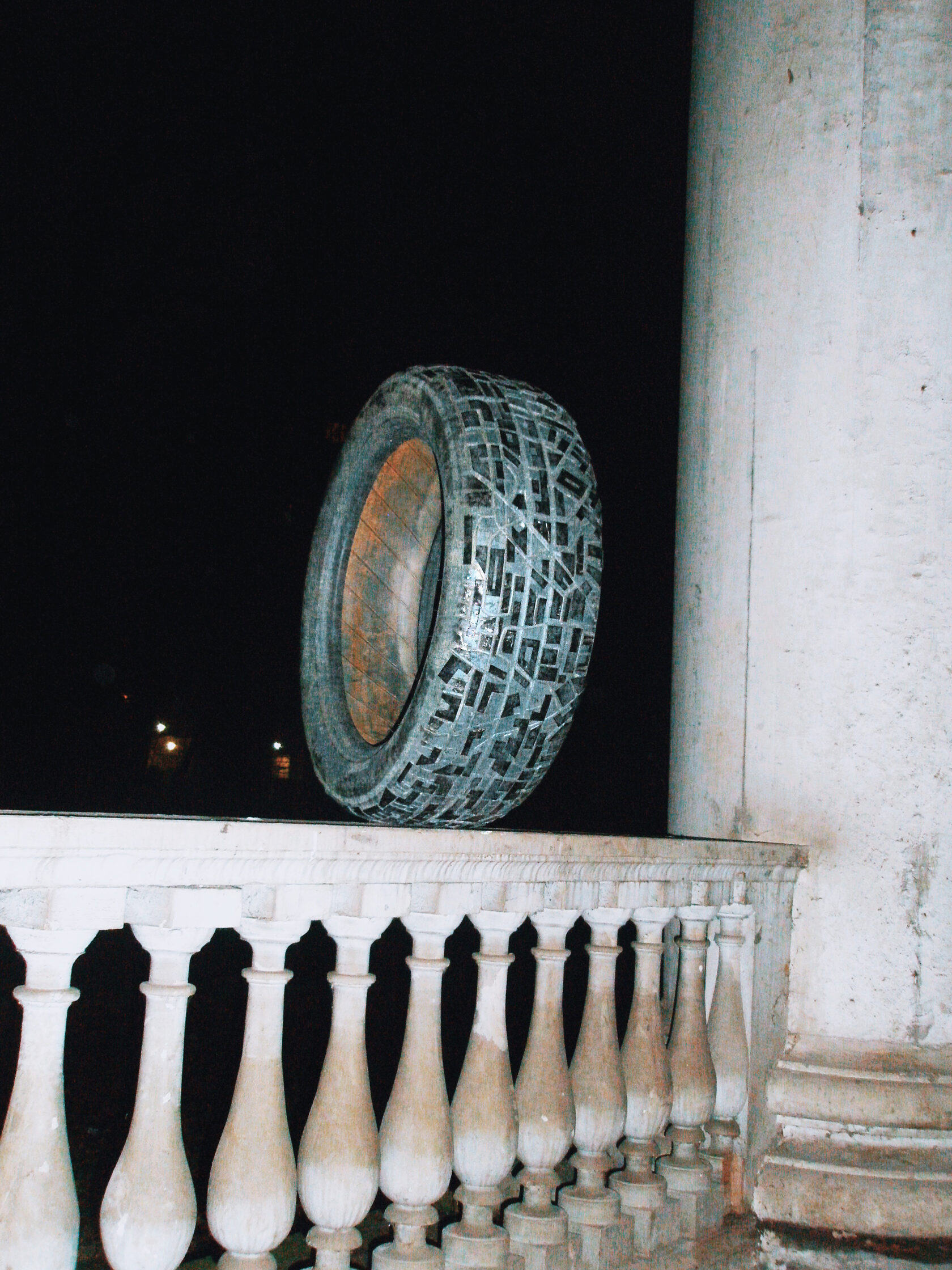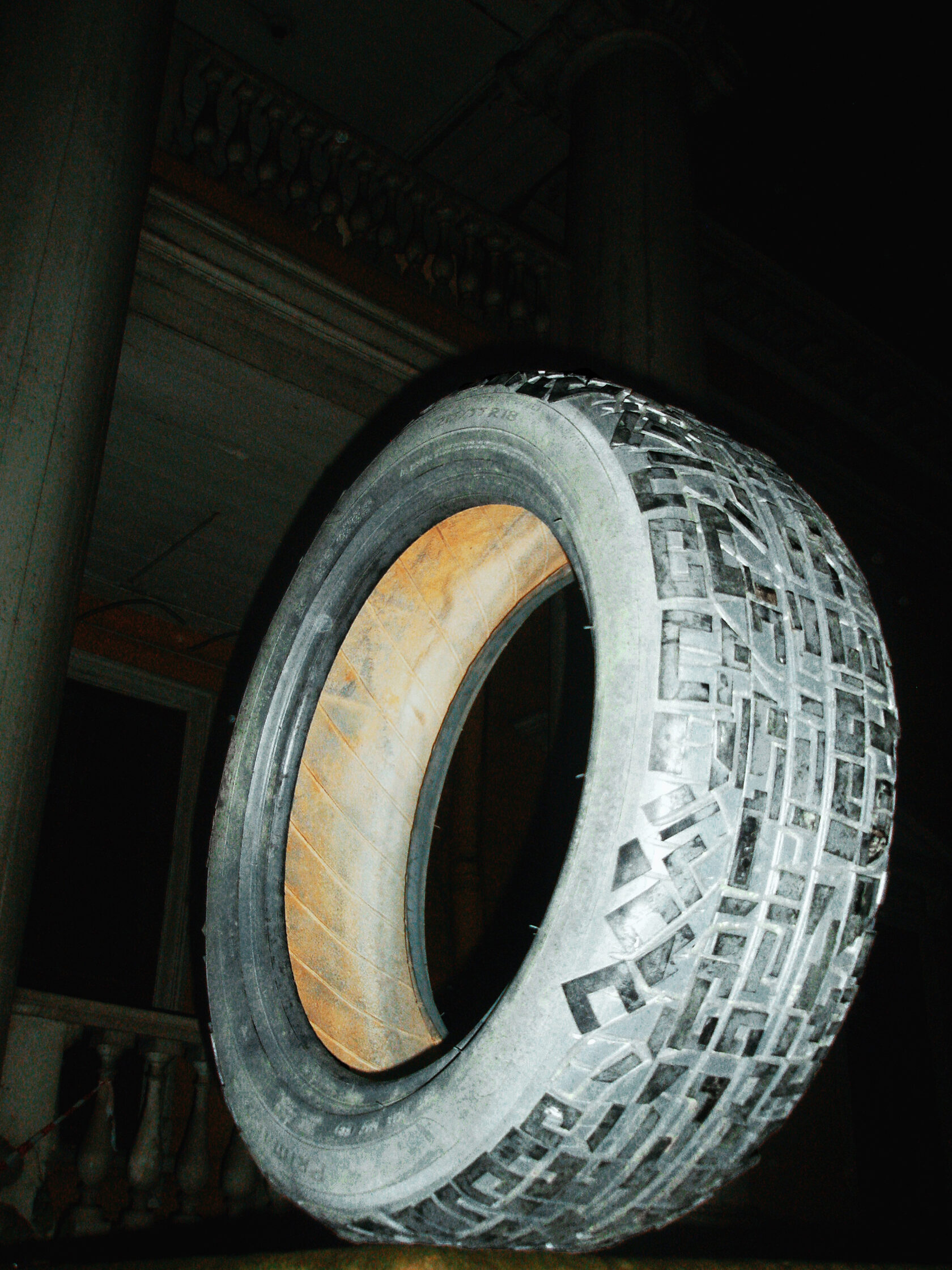 В своей интерпретации я наношу на протектор старой шины узор города — схему улиц, дворов и перекрёстков. Этот рисунок может оставлять отпечатки на песке или просто служить новым поводом для игры и воображения.