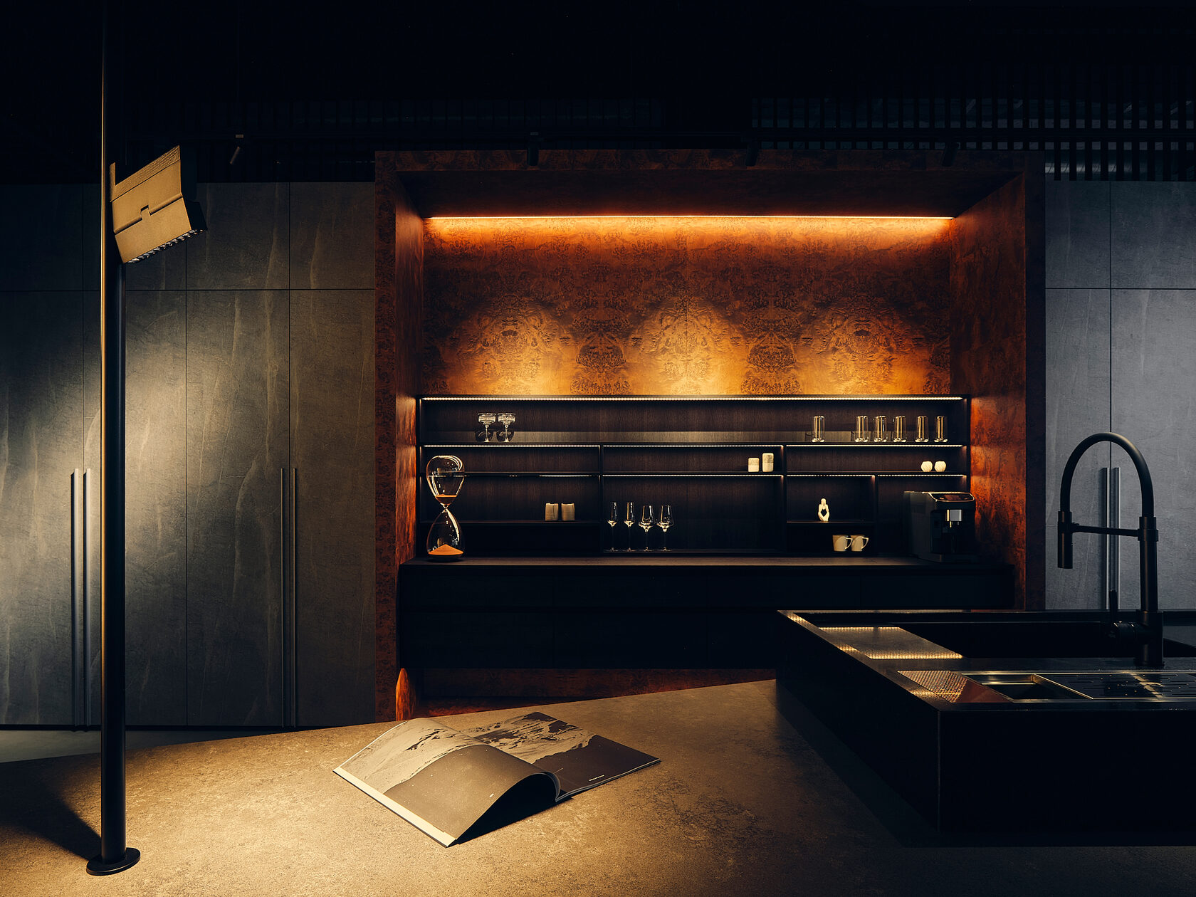 Барная конструкция открыта — и в этом её сила. Она не прячет процессы. Наоборот: процессы приготовления, взаимодействие между дизайнером и гостем становятся частью общего нарратива.