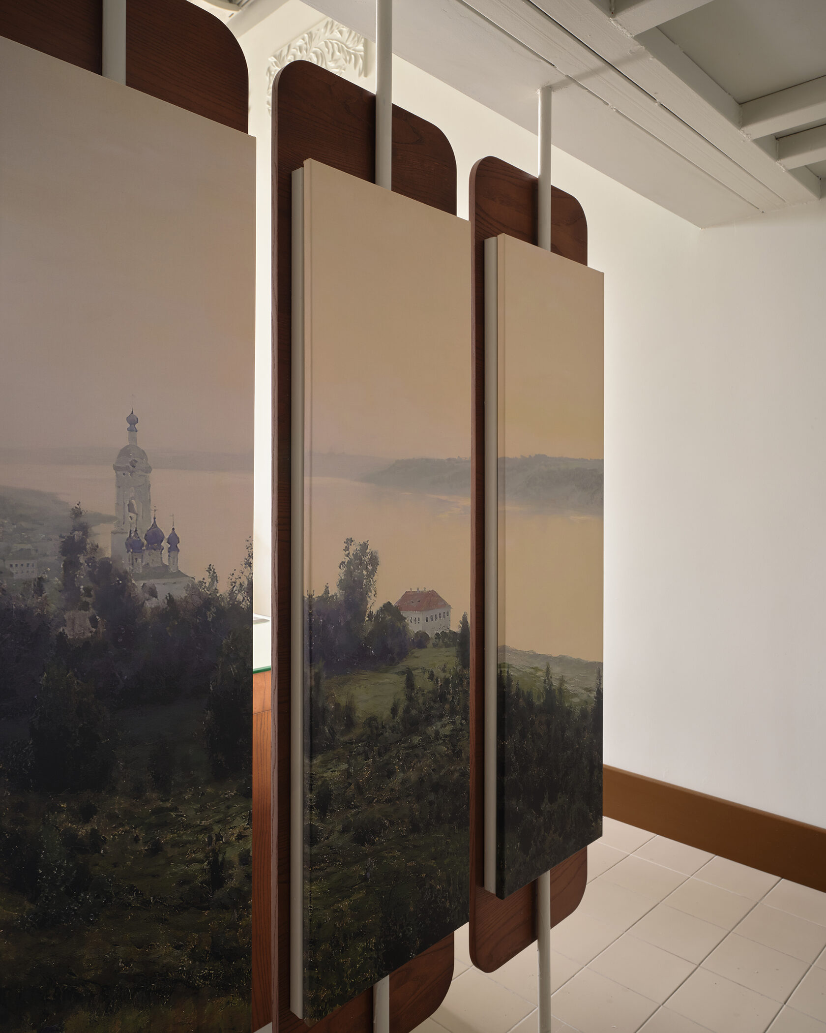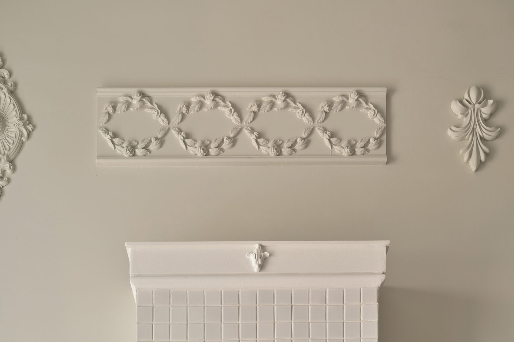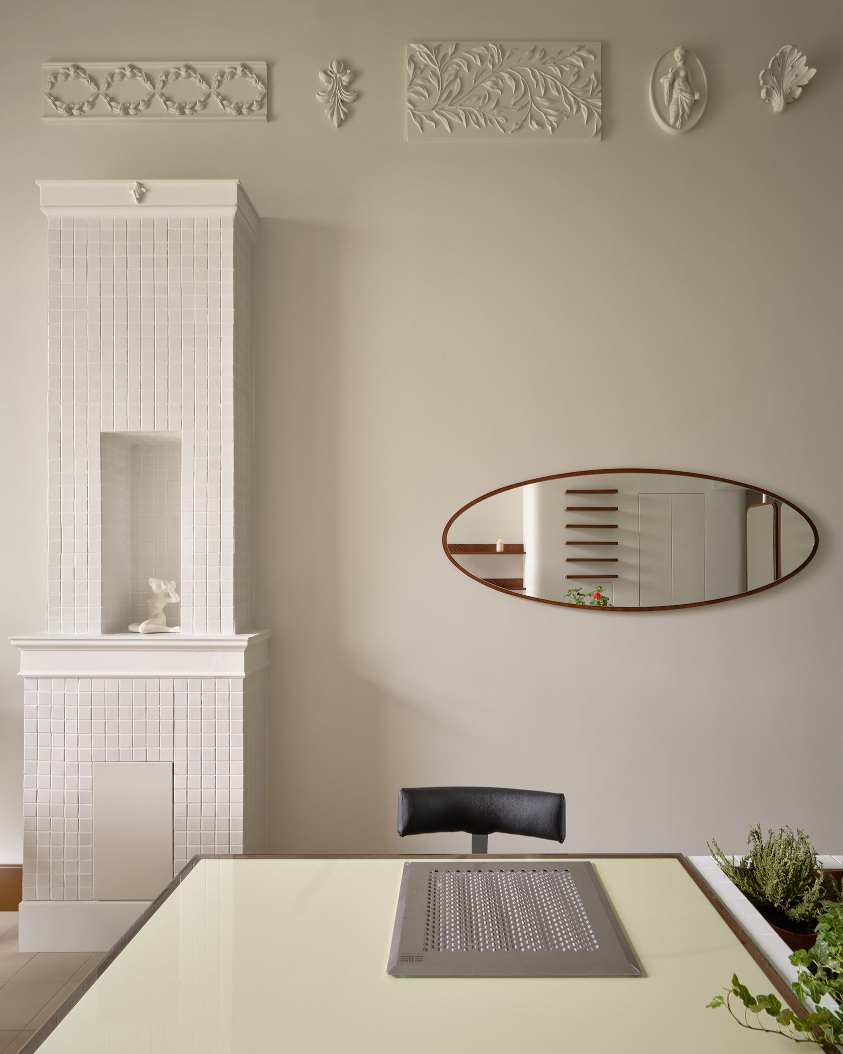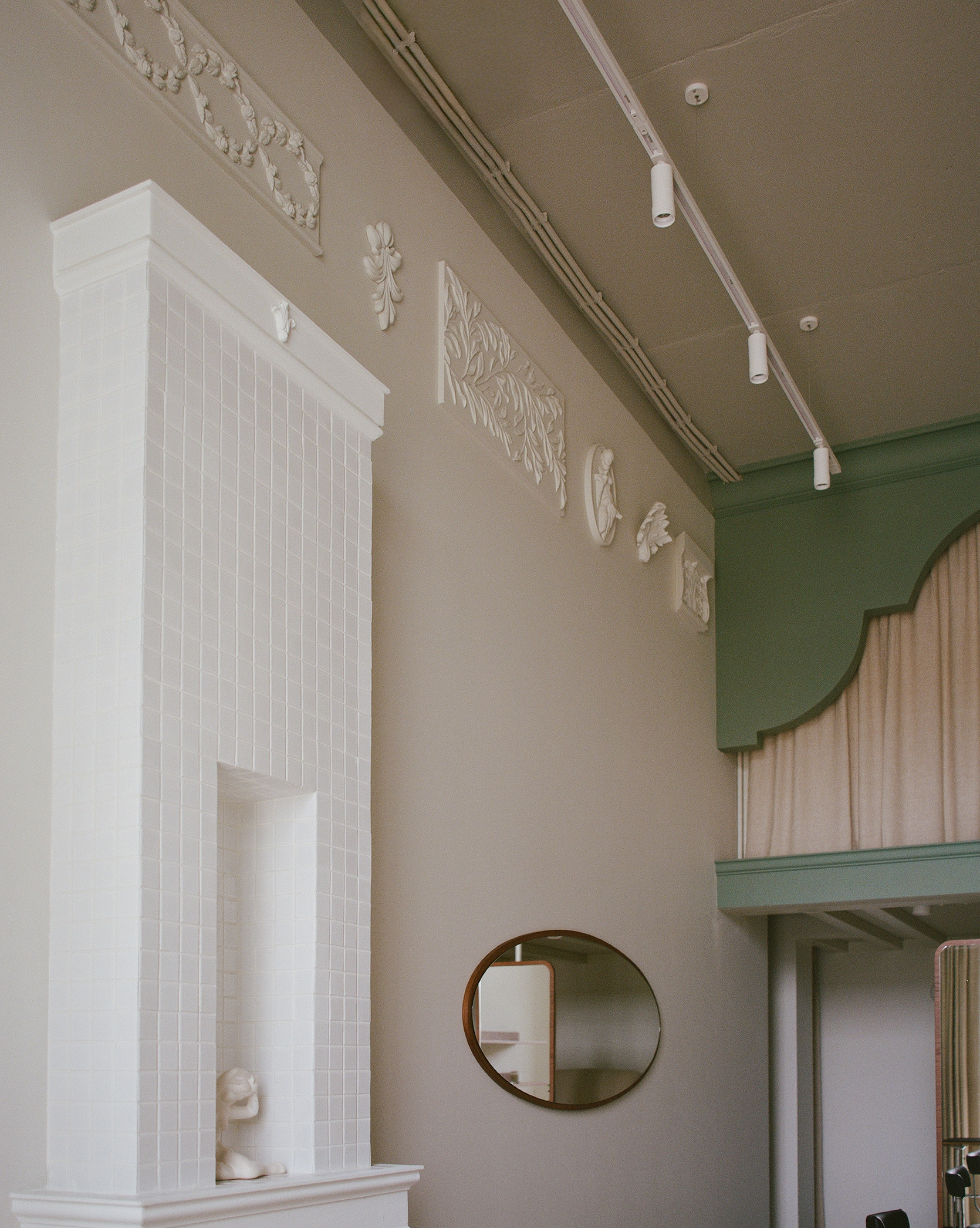 Интерьер работает с темой дома, развивая ее не напрямую, а за счет определенных знаков и нюансов. Камин — “якорь дома” — служит декорацией и скульптурой одновременно. Занавес второго этажа напоминает задернутые шторы. Лепные элементы на стенах, размещенные как будто в произвольном порядке, отсылают к домашним коллекциям античных слепков.