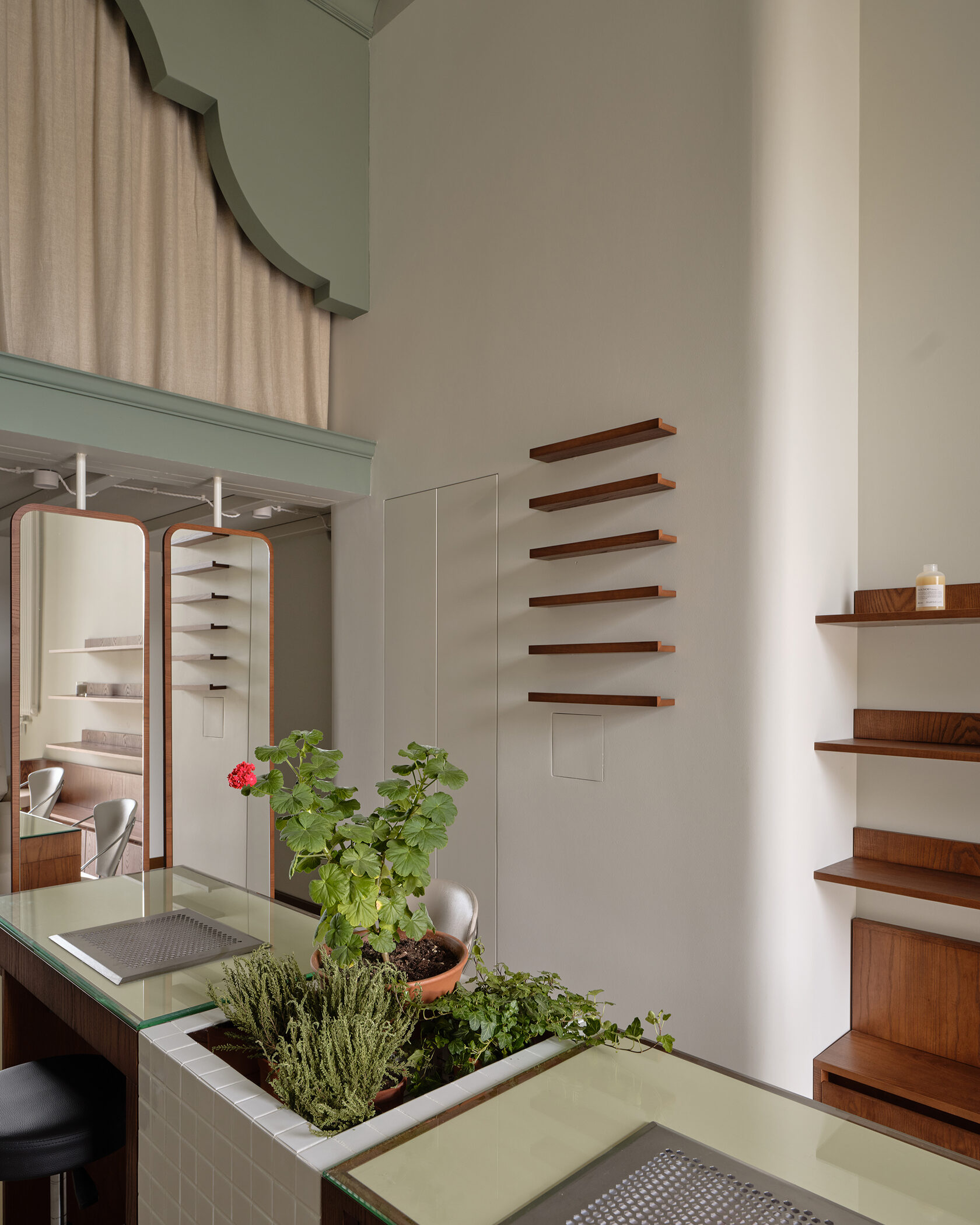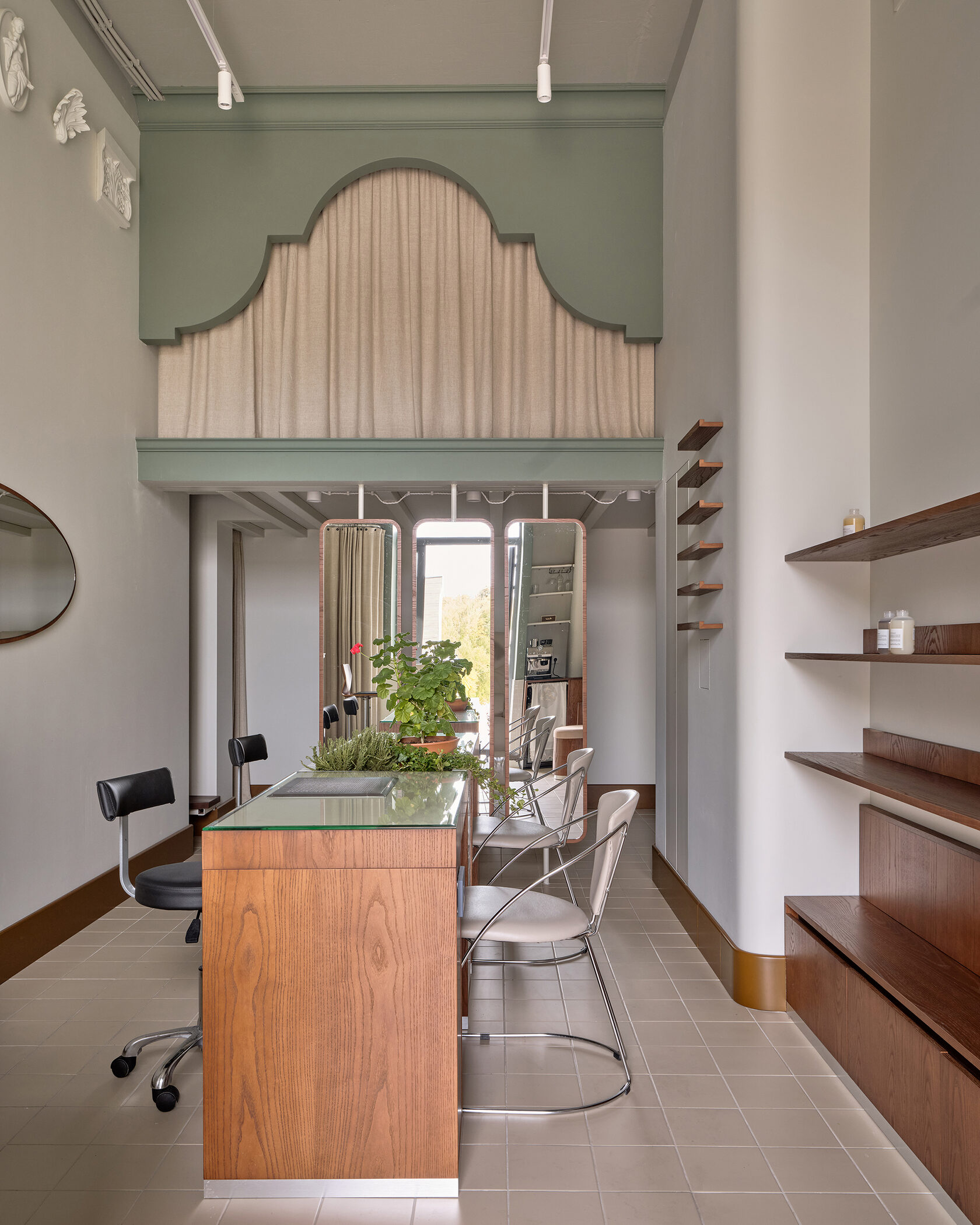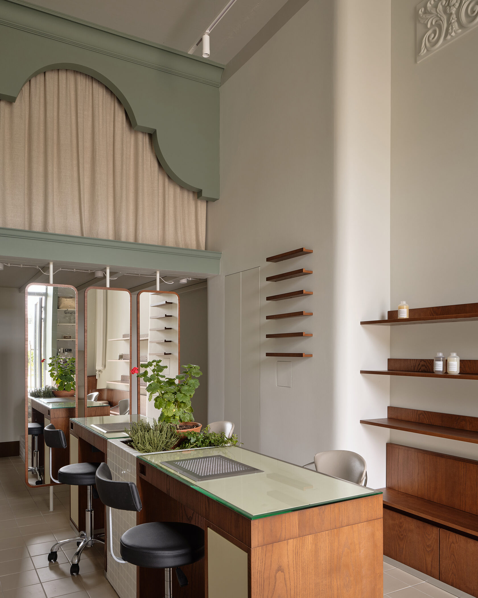 Все цвета и текстуры подбирались нами на тонких нюансах. На полу испанская керамическая плитка нежно-терракотового цвета, стены молочного тона, шторы из неосветленного натурального льна. Основной шпон — насыщенный, служащий визуальным якорем пространства и в пару к нему — серо-зеленый тон фасадной части антресоли. В маникюрные столы интегрировали светло-лимонный цвет для визуального облегчения. Стулья клиента — винтажные итальянские Effezeta с обивкой цвета "кофе с молоком".
