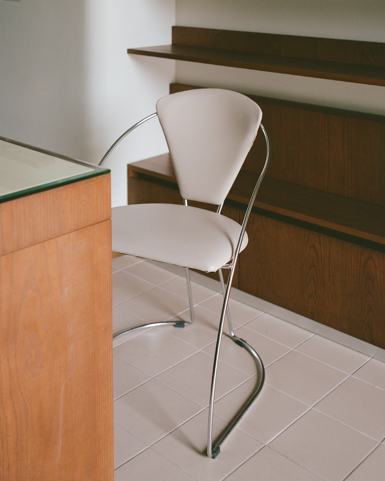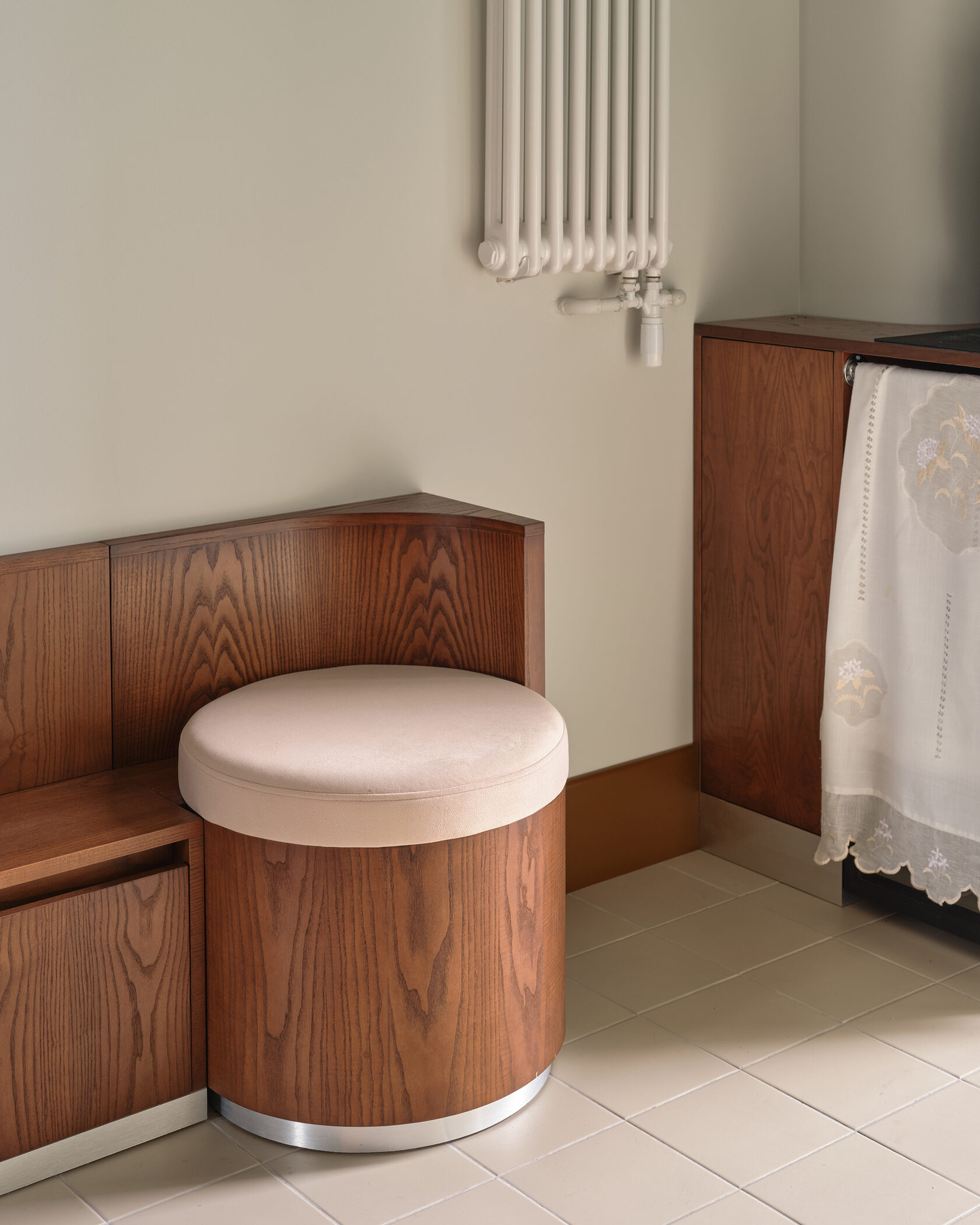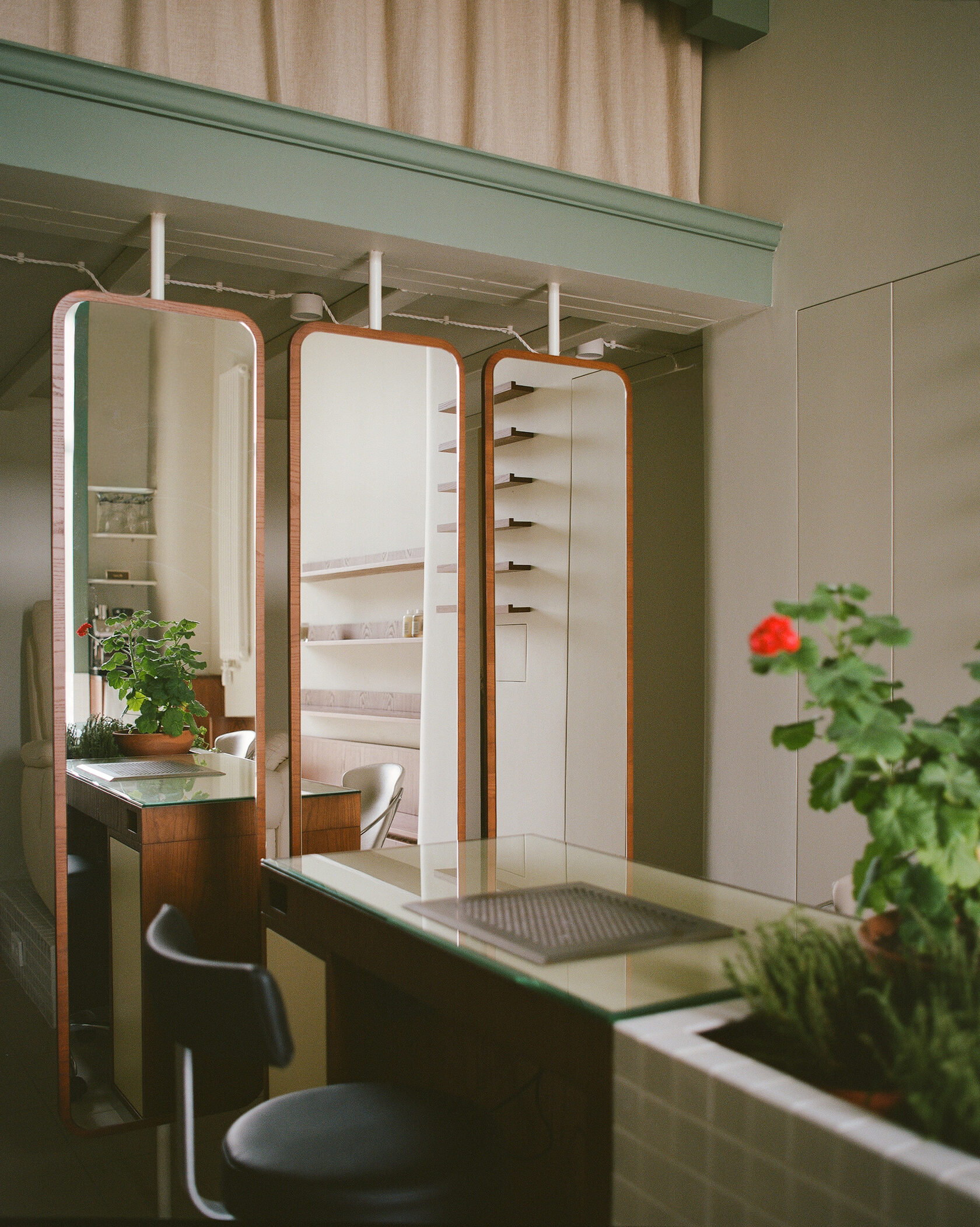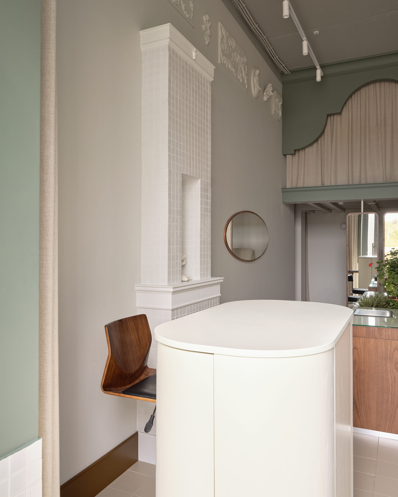 Все цвета и текстуры подбирались нами на тонких нюансах. На полу испанская керамическая плитка нежно-терракотового цвета, стены молочного тона, шторы из неосветленного натурального льна. Основной шпон — насыщенный, служащий визуальным якорем пространства и в пару к нему — серо-зеленый тон фасадной части антресоли. В маникюрные столы интегрировали светло-лимонный цвет для визуального облегчения. Стулья клиента — винтажные итальянские Effezeta с обивкой цвета "кофе с молоком".