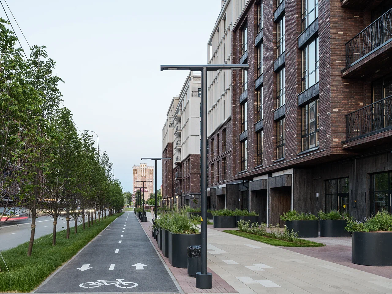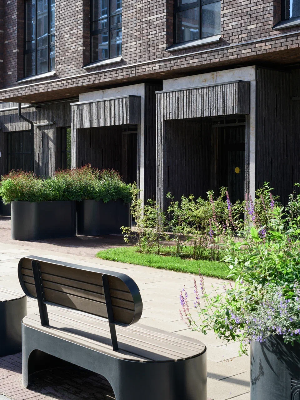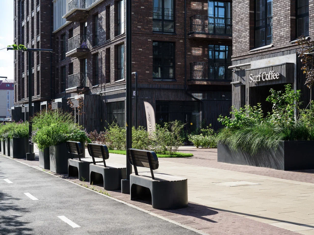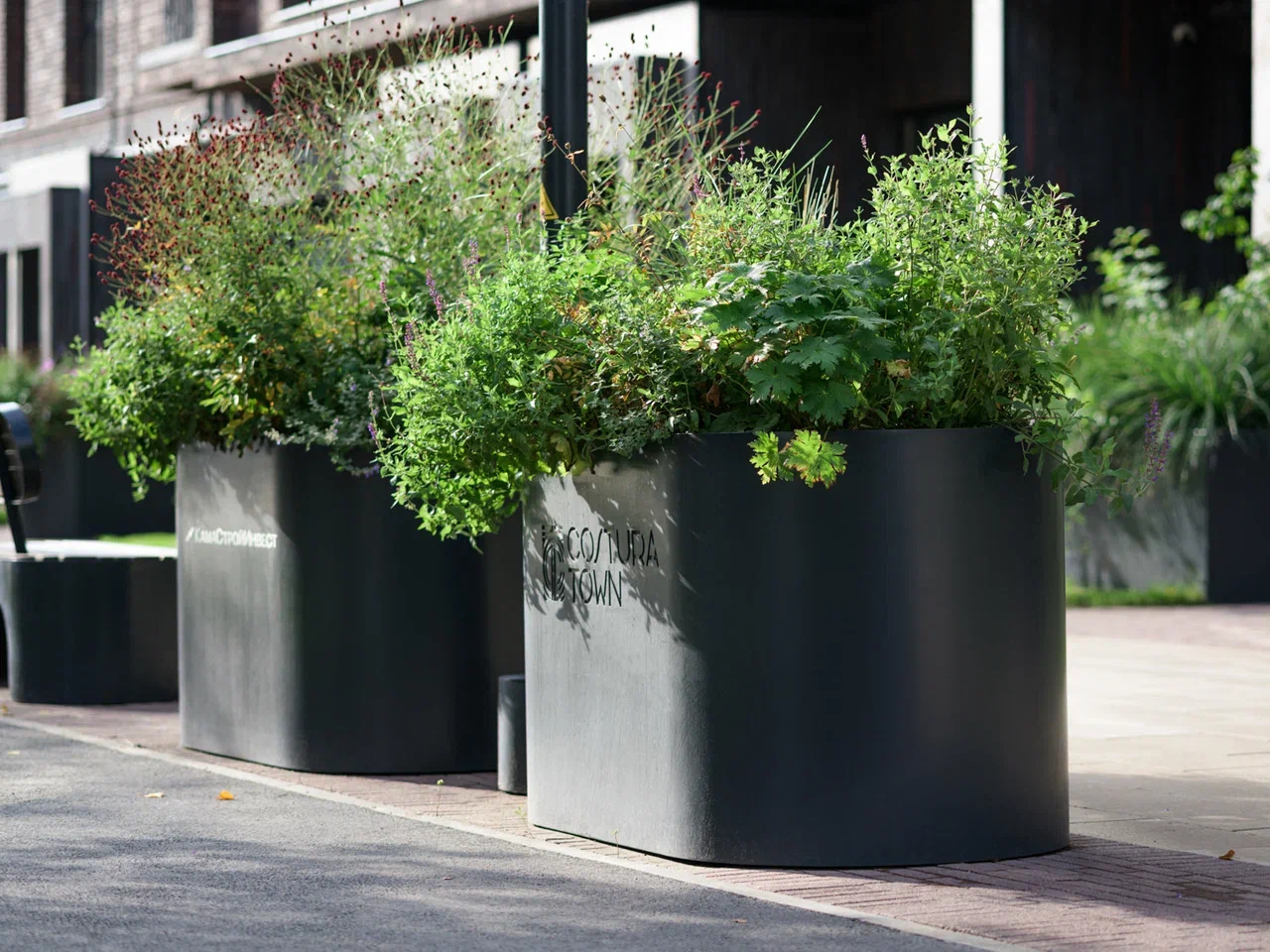 Скамейки и урны созданы как плавные изгибы металлических поверхностей, визуально напоминающие складки ткани. Металлические кадки, визуально отражающие мягкие изгибы тканного полотна, выполняют двойную функцию: создают дополнительные возможности для озеленения и формируют визуальный рельеф на плоской территории. Эти элементы позволяют избежать монотонности пространства и создать более сложную и интересную среду для пребывания.