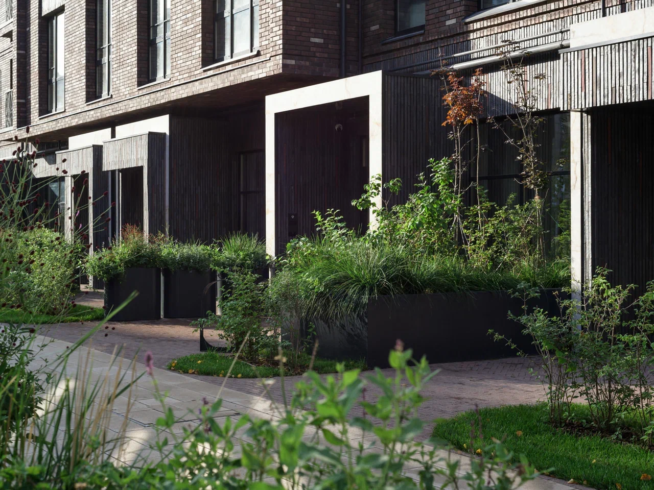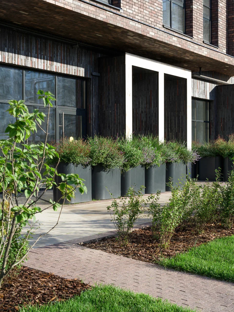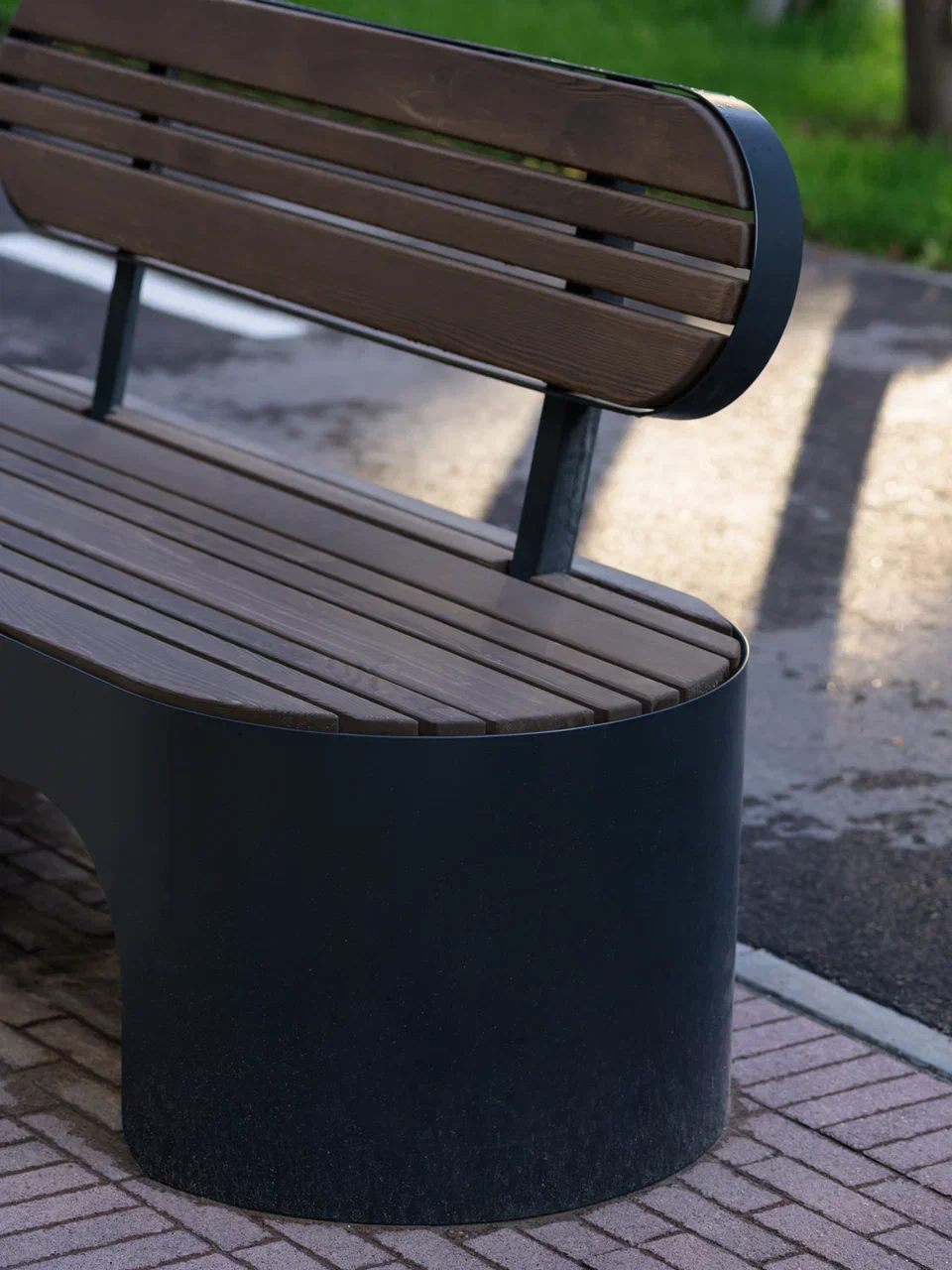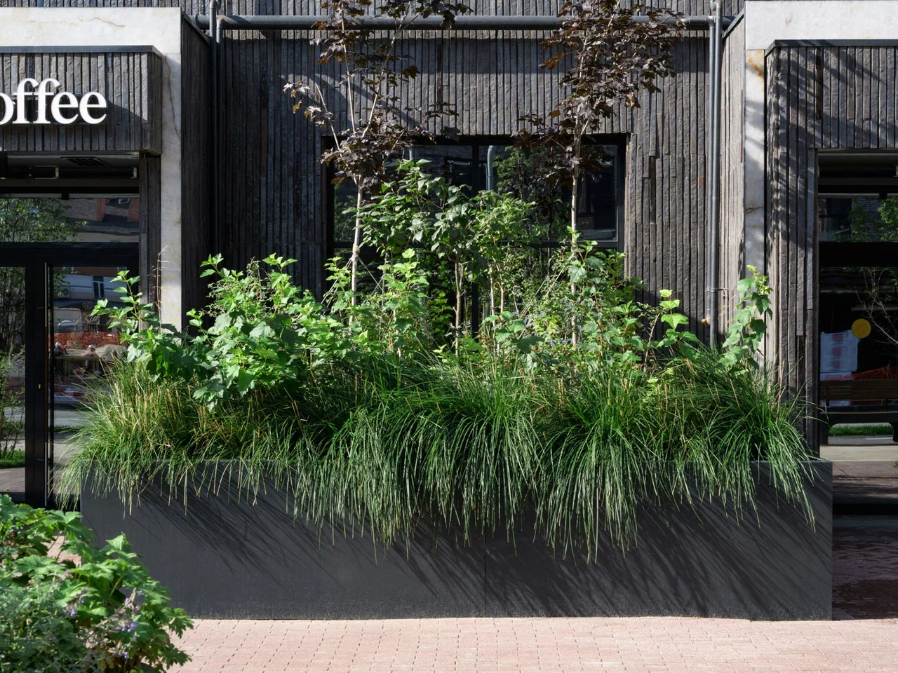 Скамейки и урны созданы как плавные изгибы металлических поверхностей, визуально напоминающие складки ткани. Металлические кадки, визуально отражающие мягкие изгибы тканного полотна, выполняют двойную функцию: создают дополнительные возможности для озеленения и формируют визуальный рельеф на плоской территории. Эти элементы позволяют избежать монотонности пространства и создать более сложную и интересную среду для пребывания.