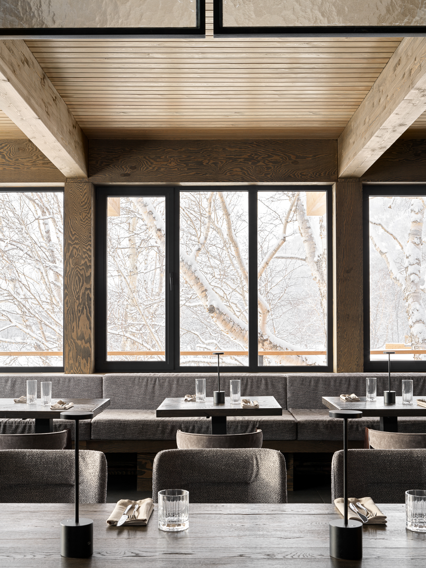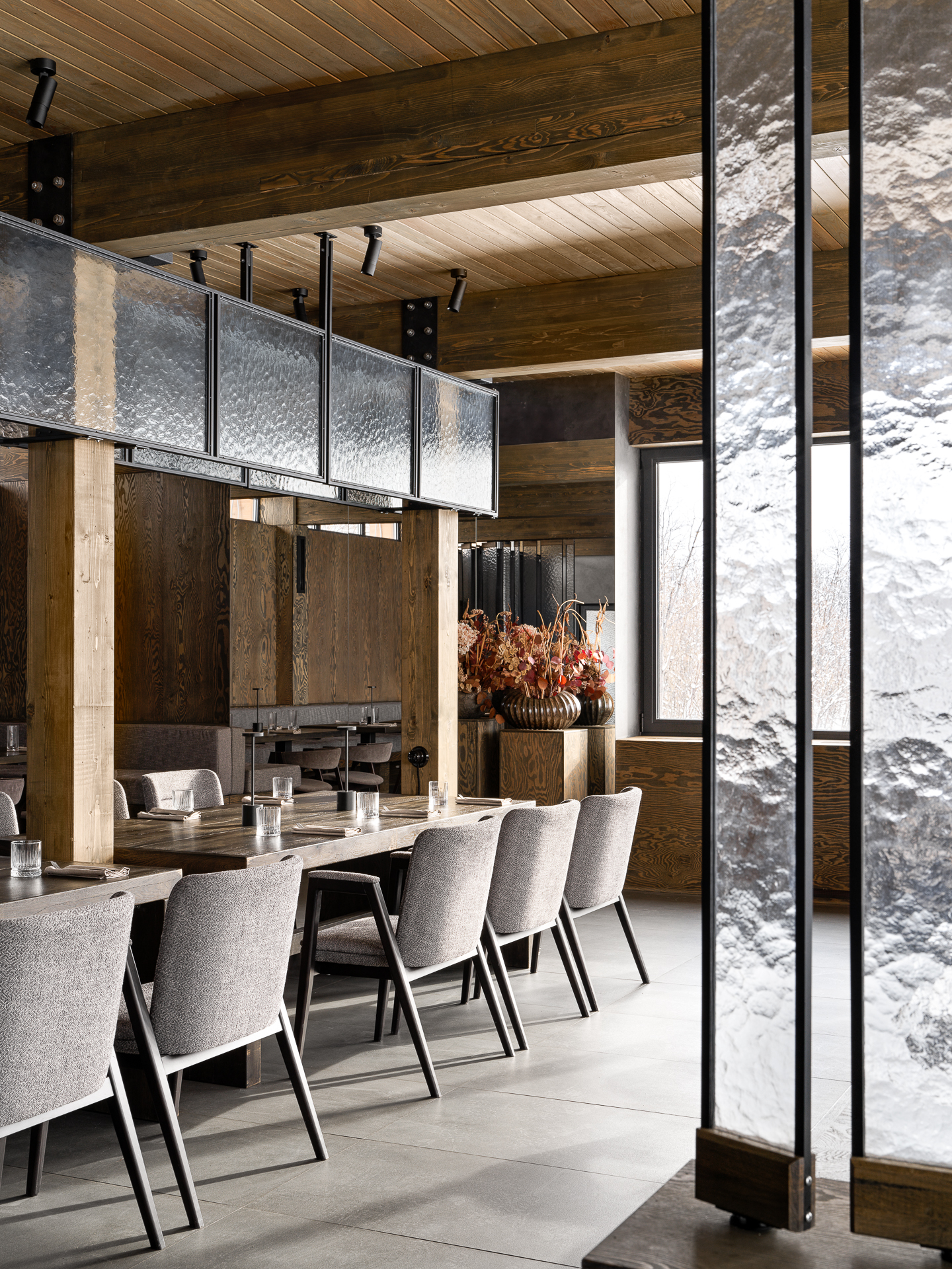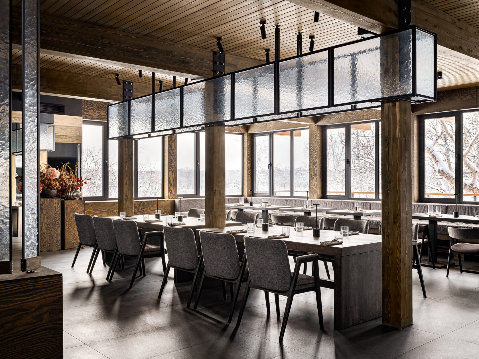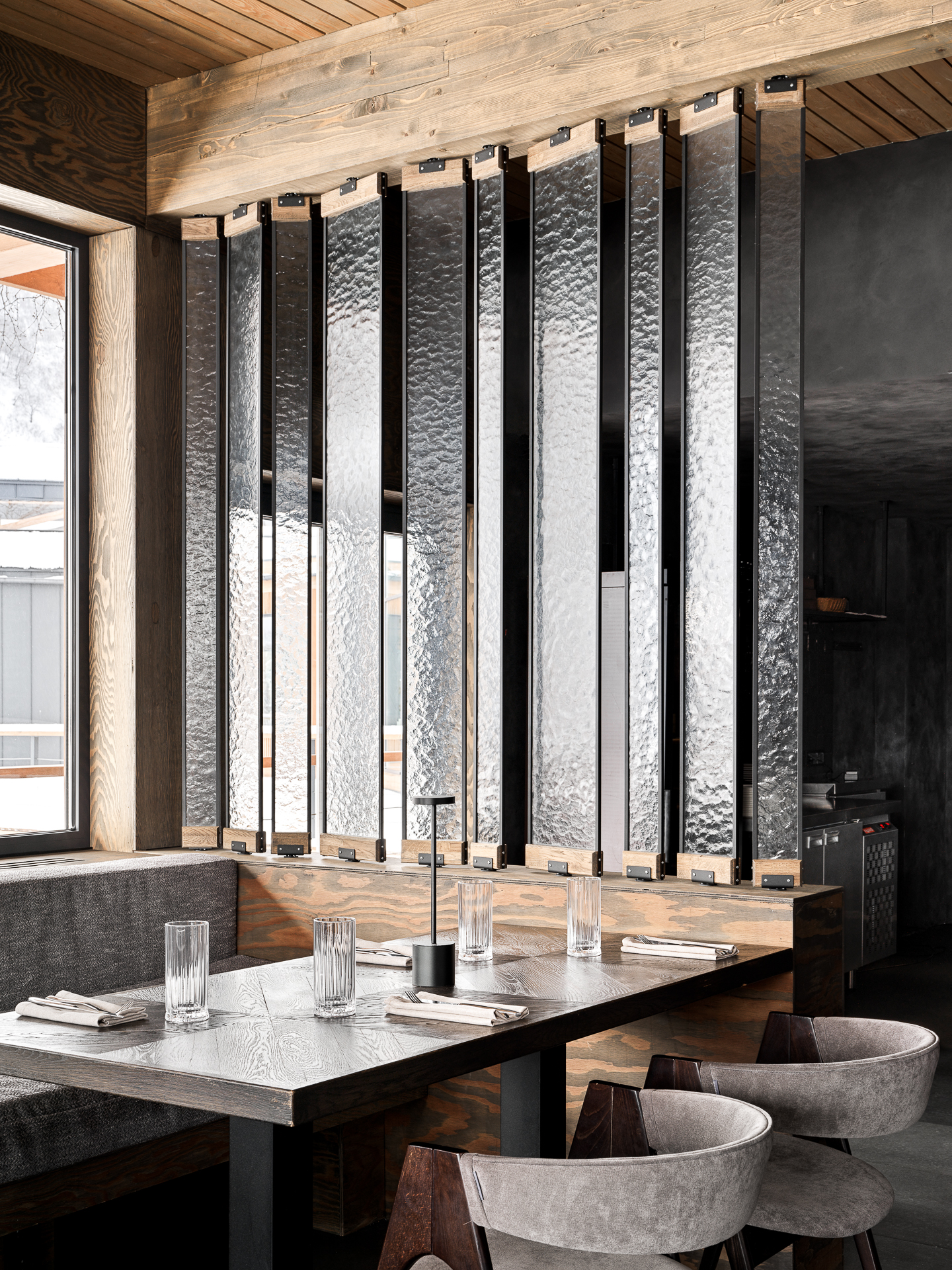Из любой точки ресторана открываются панорамные виды на лес, который будто входит в его внутреннее пространство. Это ощущение дополняет игра света, отражений и тени на установленных под разными углами вертикальных панелях из рифленого стекла. С одной стороны, они выполняют функцию зонирования и дают гостям чуть больше приватности, а с другой, рифмуются с черно-белыми стволами вековых берез за окном. Иллюзия «перетекания» ландшафта стирает границу между интерьером и экстерьером, позволяя посетителям в полной мере насладиться ощущением единения с природой. Ведь именно за этим люди и едут за тысячи километров от дома «на край Земли».
