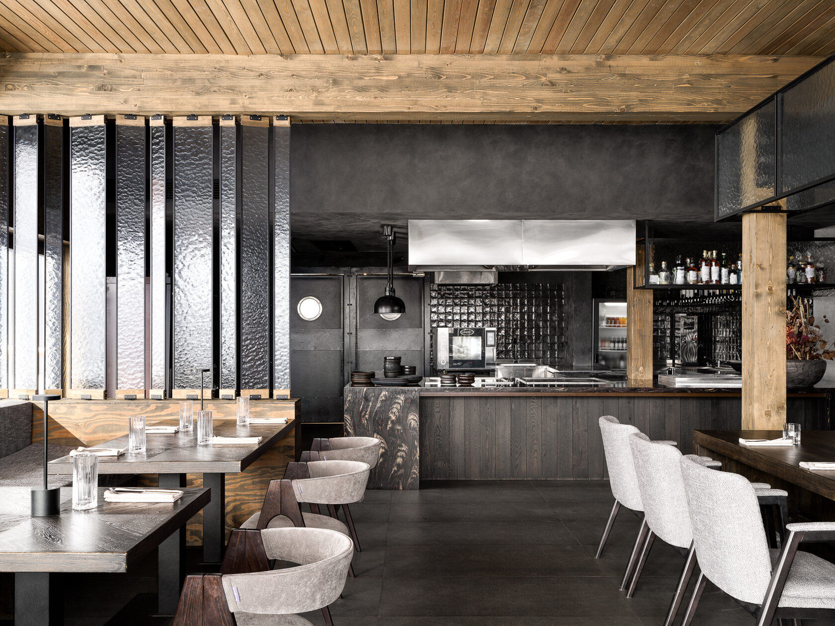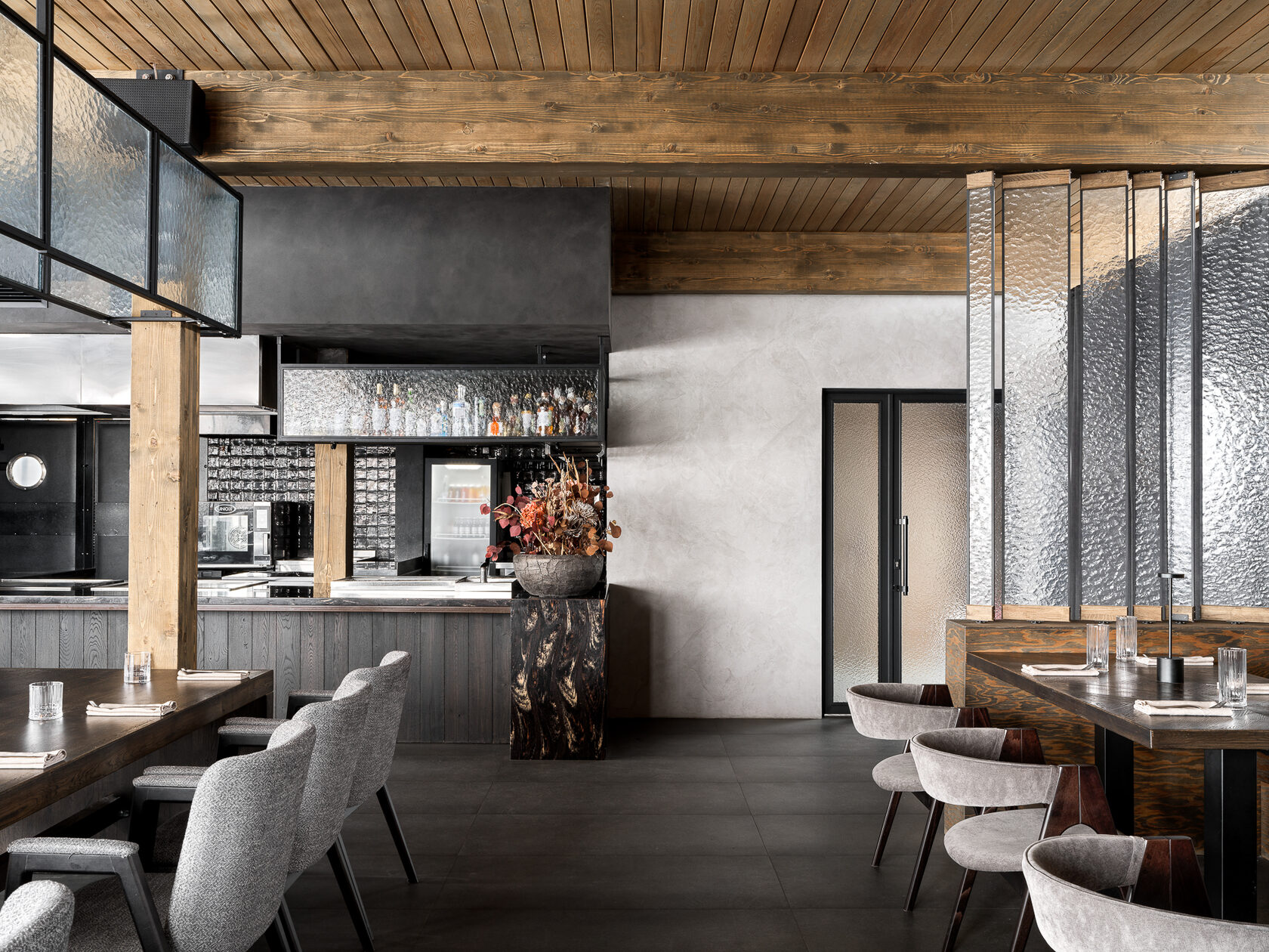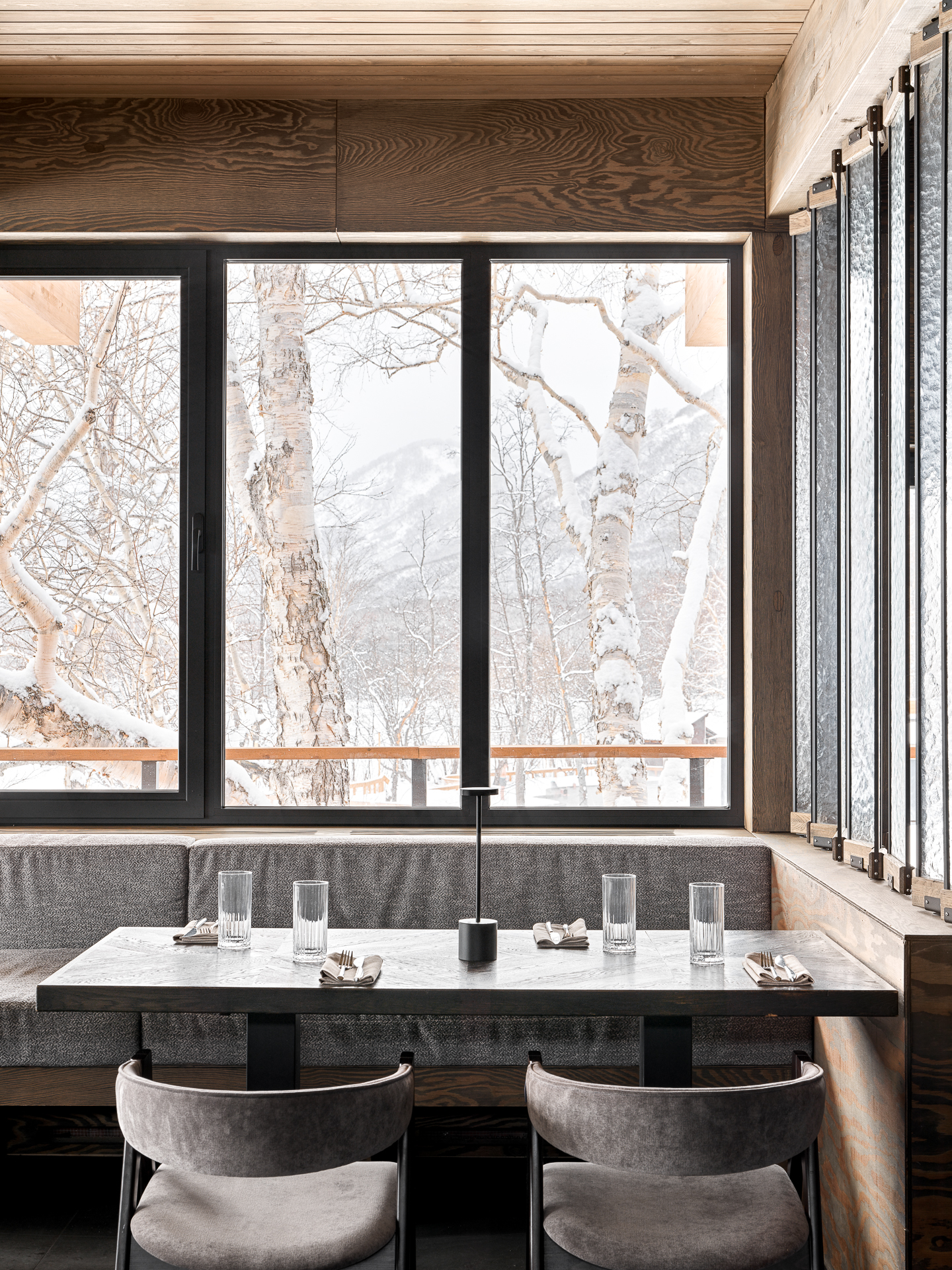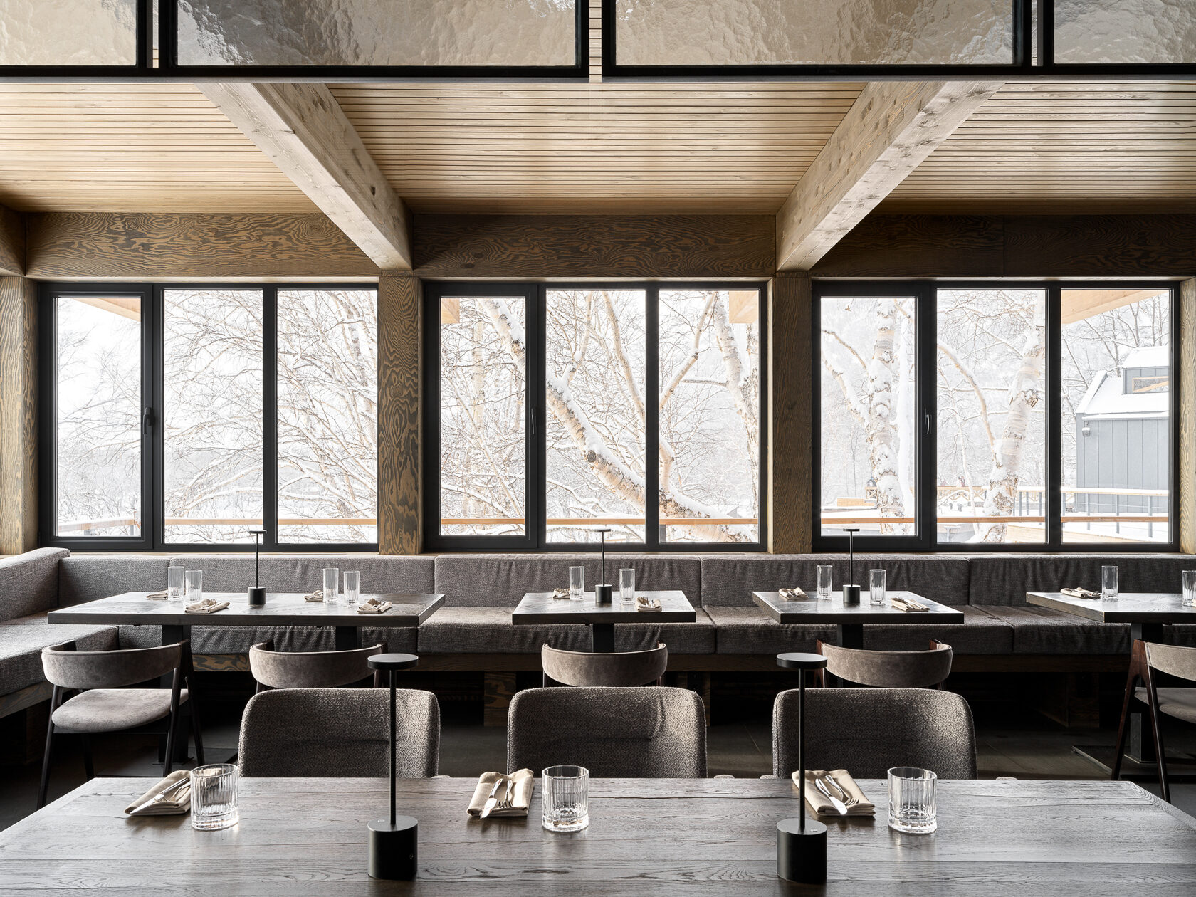 Из любой точки ресторана открываются панорамные виды на лес, который будто входит в его внутреннее пространство. Это ощущение дополняет игра света, отражений и тени на установленных под разными углами вертикальных панелях из рифленого стекла. С одной стороны, они выполняют функцию зонирования и дают гостям чуть больше приватности, а с другой, рифмуются с черно-белыми стволами вековых берез за окном. Иллюзия «перетекания» ландшафта стирает границу между интерьером и экстерьером, позволяя посетителям в полной мере насладиться ощущением единения с природой. Ведь именно за этим люди и едут за тысячи километров от дома «на край Земли».