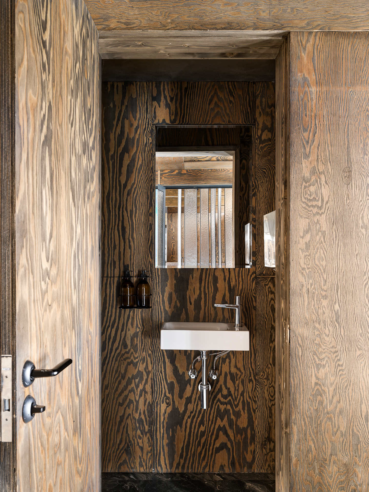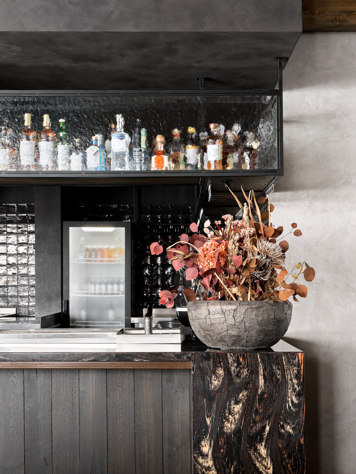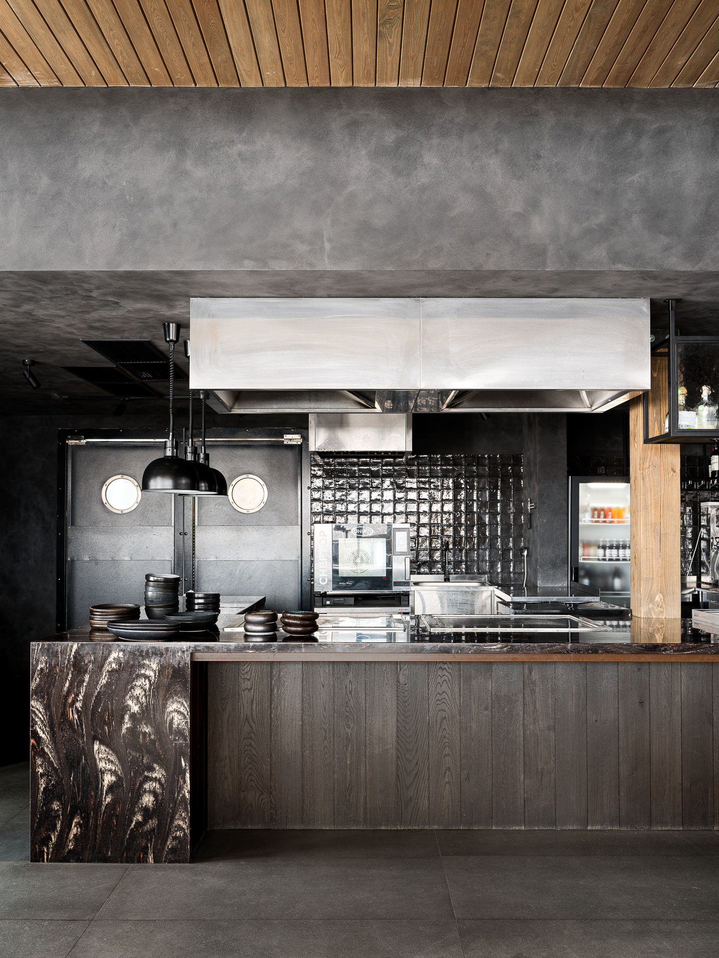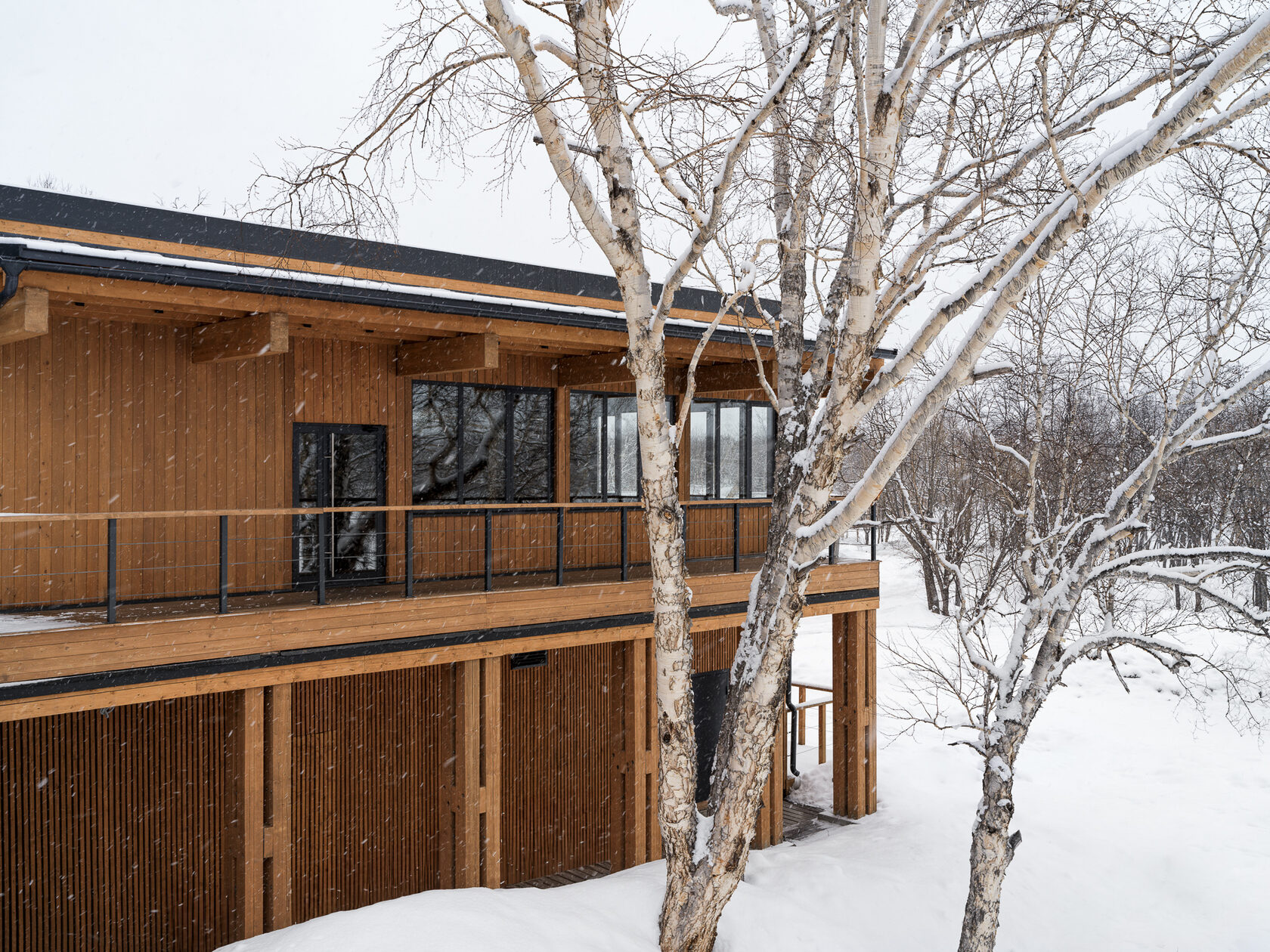 Из любой точки ресторана открываются панорамные виды на лес, который будто входит в его внутреннее пространство. Это ощущение дополняет игра света, отражений и тени на установленных под разными углами вертикальных панелях из рифленого стекла. С одной стороны, они выполняют функцию зонирования и дают гостям чуть больше приватности, а с другой, рифмуются с черно-белыми стволами вековых берез за окном. Иллюзия «перетекания» ландшафта стирает границу между интерьером и экстерьером, позволяя посетителям в полной мере насладиться ощущением единения с природой. Ведь именно за этим люди и едут за тысячи километров от дома «на край Земли».