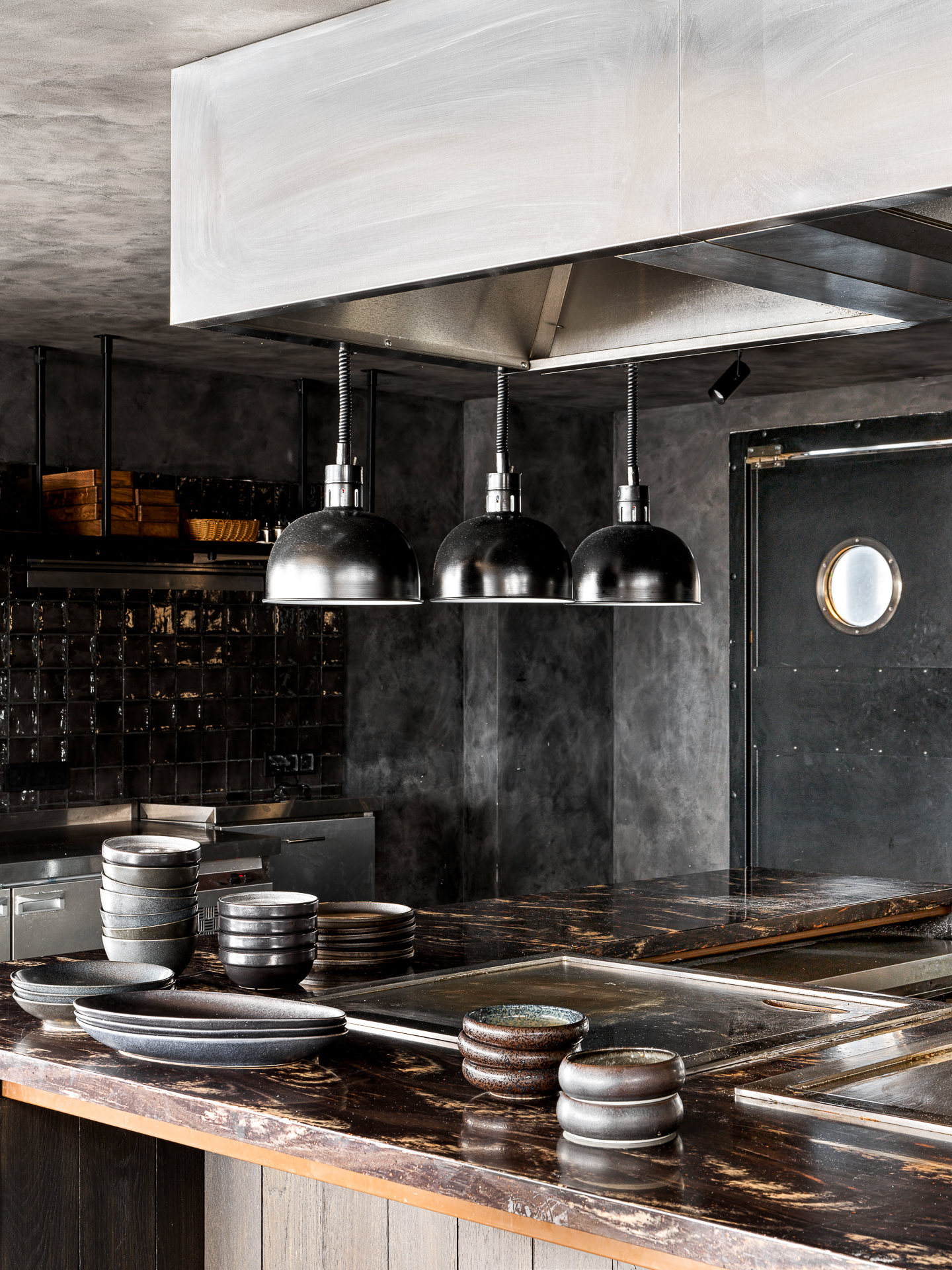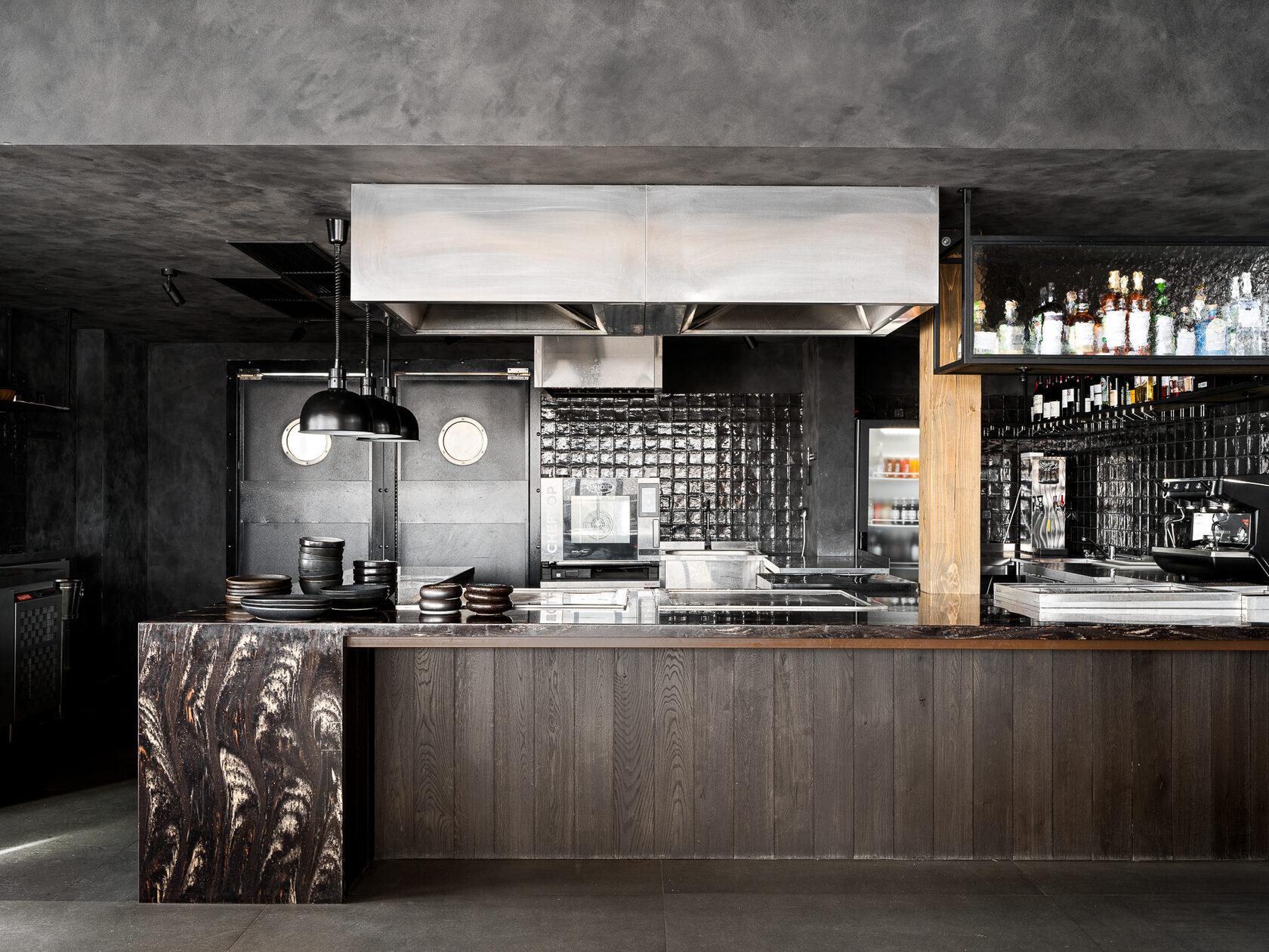 Так, камерное пространство нового ресторана на 40 мест поделено на несколько посадочных зон с массивными деревянными столами, мягкими диванами и уютными креслами. Темный дуб столешниц и барной стойки контрастирует с янтарно-медовыми оттенками фанеры. Благодаря тому, что она покрыта маслом, создающим благородный сатиновый эффект, выполненные из фанеры элементы гармонично сочетаются с остальными отделочными материалами: декоративной штукатуркой, графитовым искусственным камнем пола, фактурной глазурованной плиткой кухонной зоны.