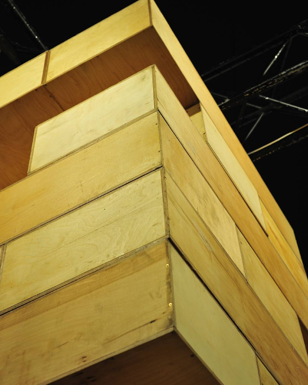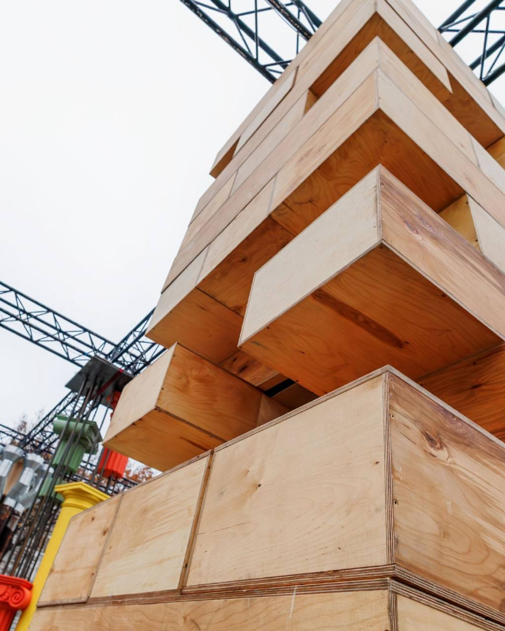 Процесс сборки превратился в настоящий перформанс — игру в архитектуру, где мы буквально «строили ордер» из гигантских деревянных элементов, как конструктор. Это соединение игры и инженерии стало сутью нашего проекта.