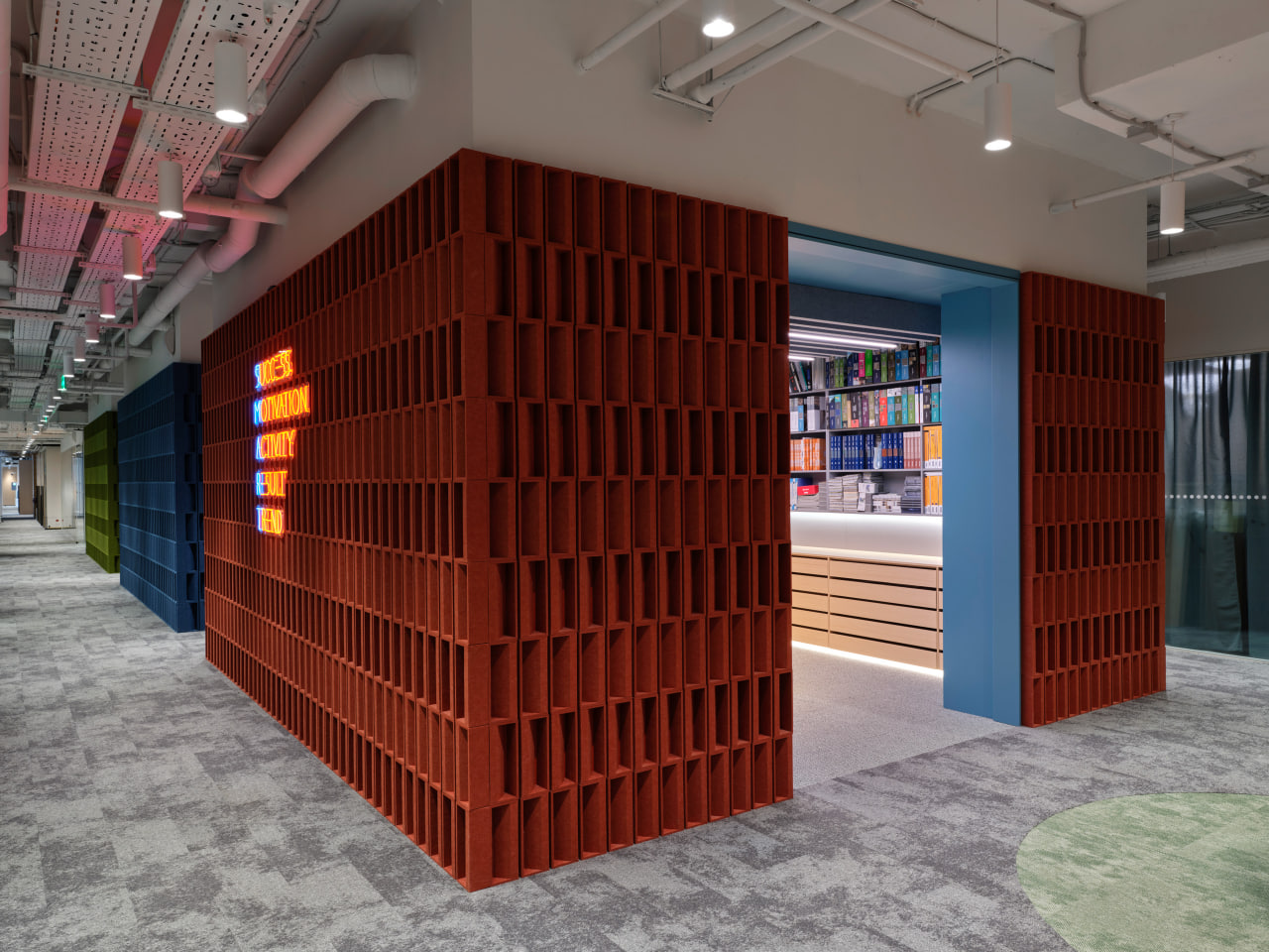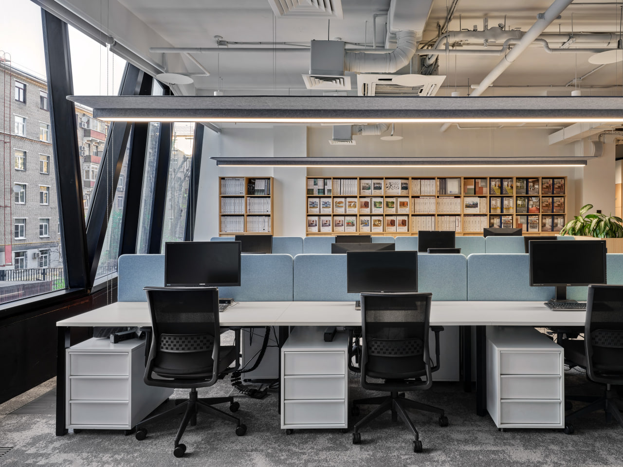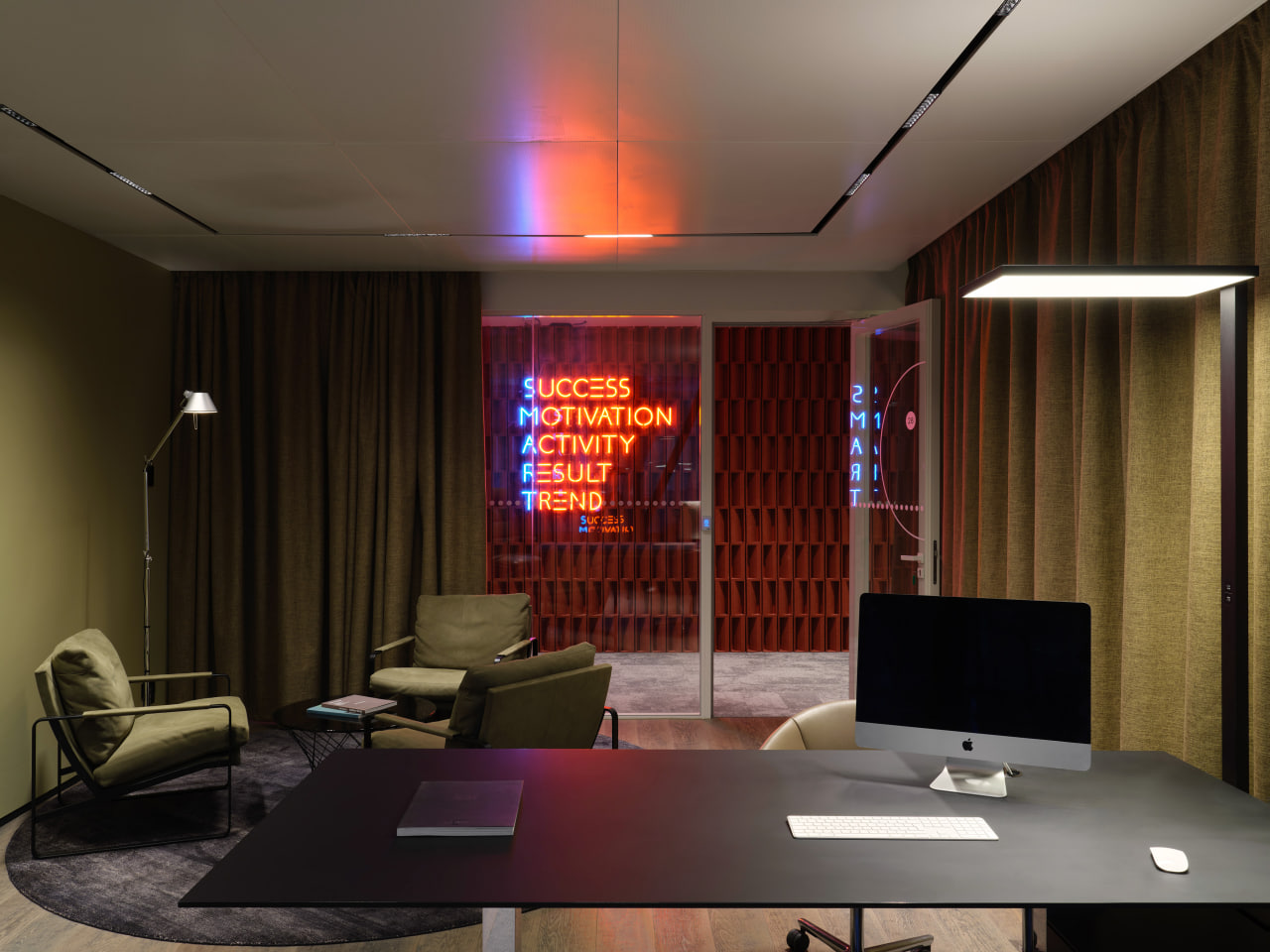Новая площадка объединила команды более 20 брендов и направлений. Особое внимание в пространстве уделено грамотному зонированию, адаптированному под особенности работы компании. Офис разделен на 3 блока: клиентская зона для бизнес-встреч, зона front office для работы с материалами и зонами совместной работы, backoffice — более уединенное пространство для сосредоточенной работы.
