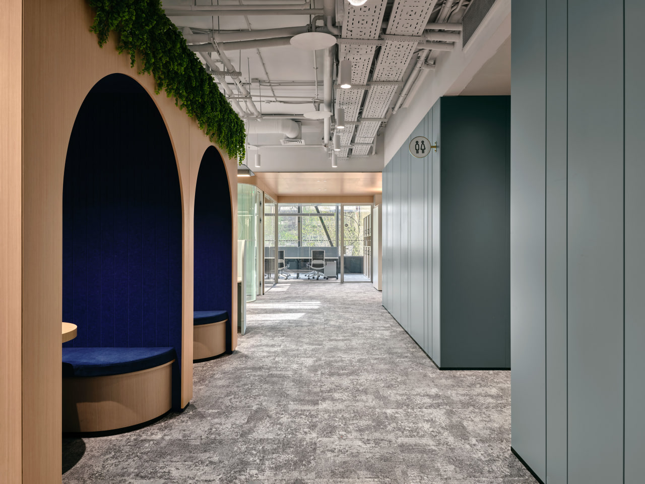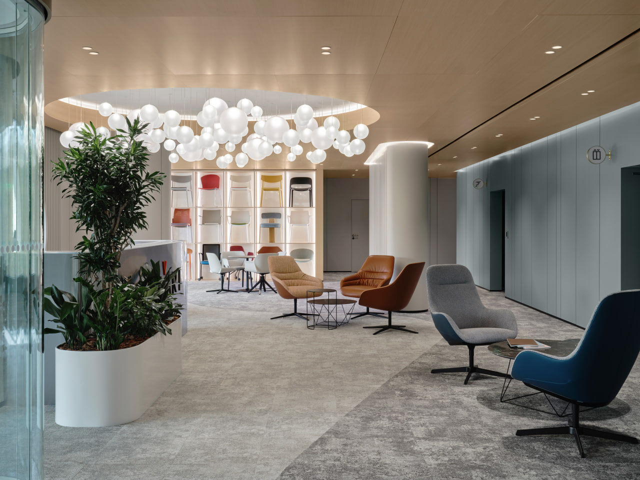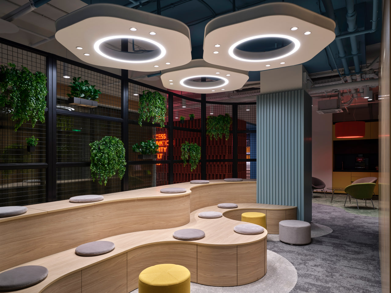 Гибкие трансформируемые решения, ставшие трендом последних лет, обеспечивают возможность оперативной смены обстановки и agile-процессов. Тихие и уединенные зоны для работы позволяют сосредоточиться на важных задачах или отдохнуть в течение рабочего дня. Наличие зон для рекреации и большого числа рабочих мест разного формата позволили добиться комфортной атмосферы для сотрудников разных поколений, в том числе и поколения Z.