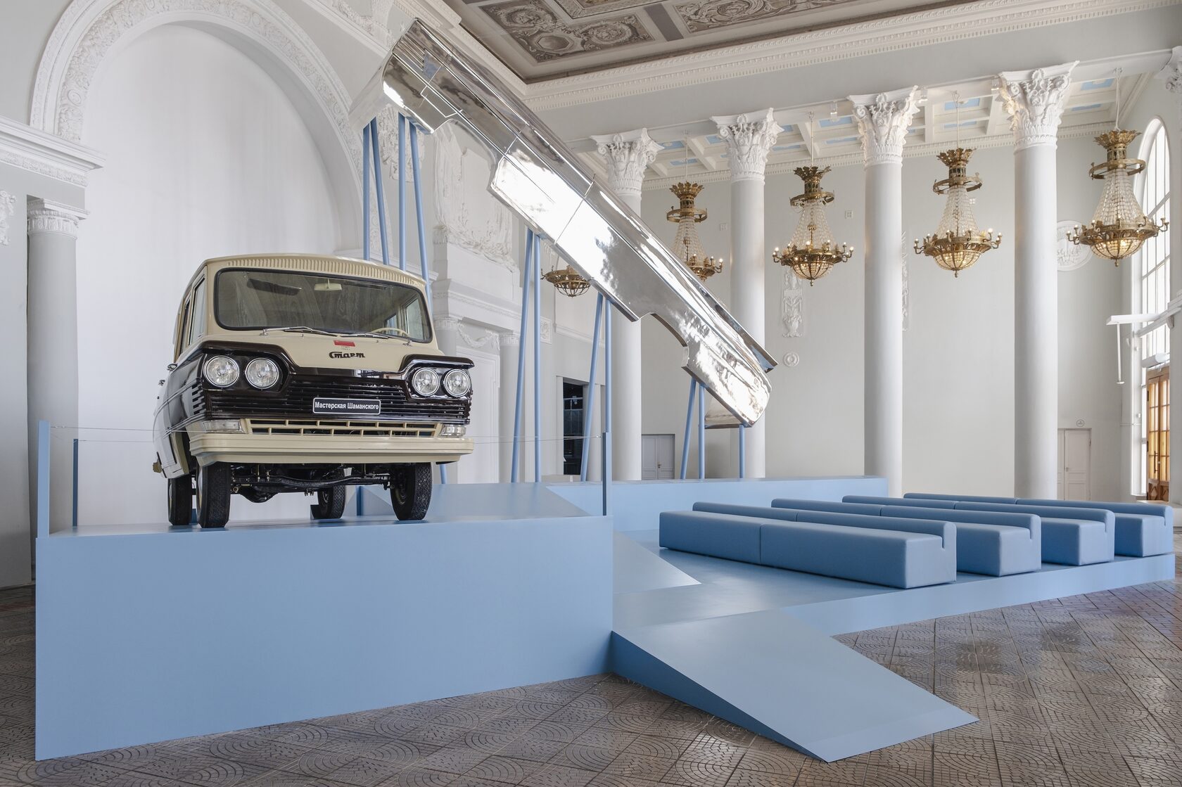 В портике павильона ВДНХ открылась обновлённая инсталляция к выставке «Ты выглядишь на все 100!», созданная Музеем транспорта Москвы в сотрудничестве с архитектурным бюро .dpt. В центре — радикальное переосмысление советского микроавтобуса «Старт».