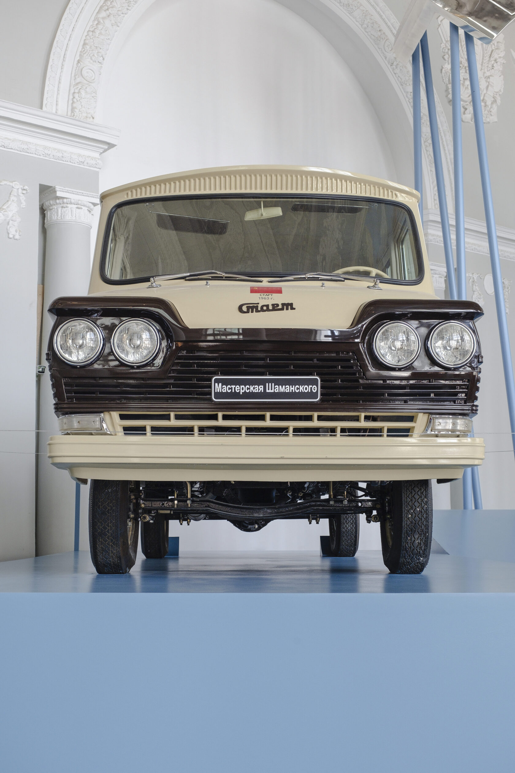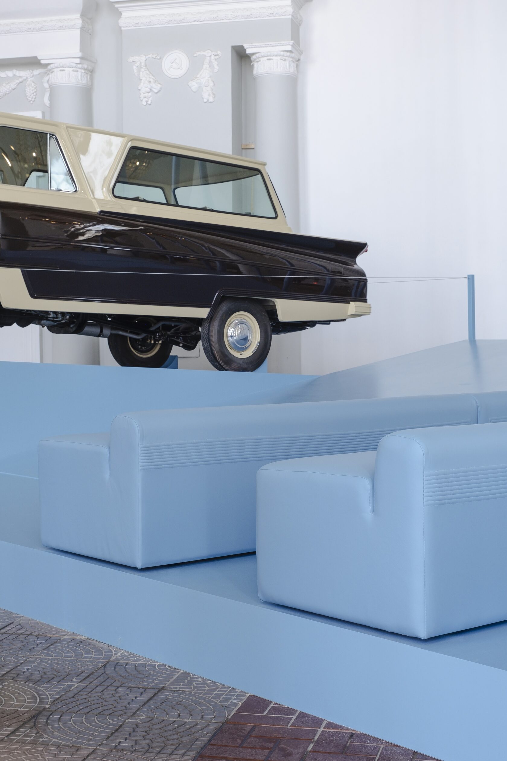 Подиум с упрощёнными автомобильными сидениями и характерной строчкой переосмысляет интерьер «Старта». Цвета выбраны с точной отсылкой к оригинальной модели. Завершает композицию сам автомобиль — как итог технической мысли эпохи.