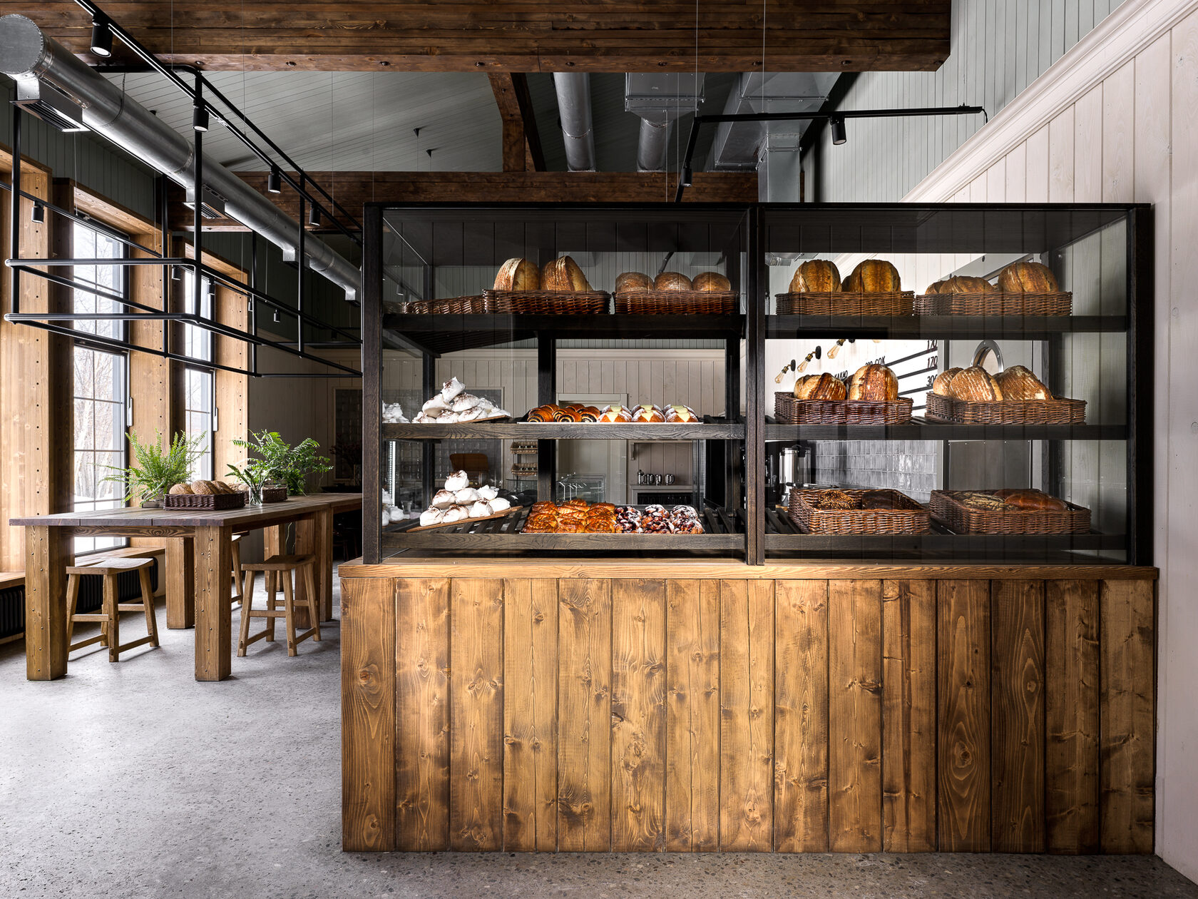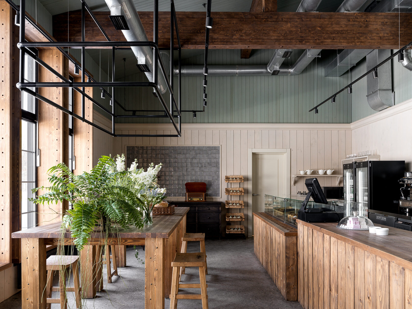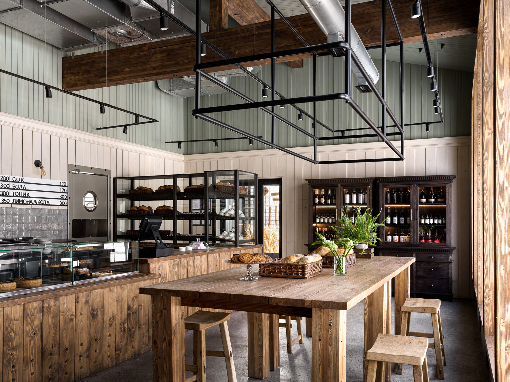 Интерьер булочной продуман до мелочей: пол выполнен из полированного бетона с гранитным наполнителем, отделка стен выполнена из вагонки и покрашена, зона бара выделена акцентной плиткой, а общий стиль дополнен яркими элементами: большой деревянный стол из сосны и комоды из массива ясеня в стиле современной классики. Благодаря высокой односкатной кровле (5,5 метров в коньке) пространство светлое и просторное.
